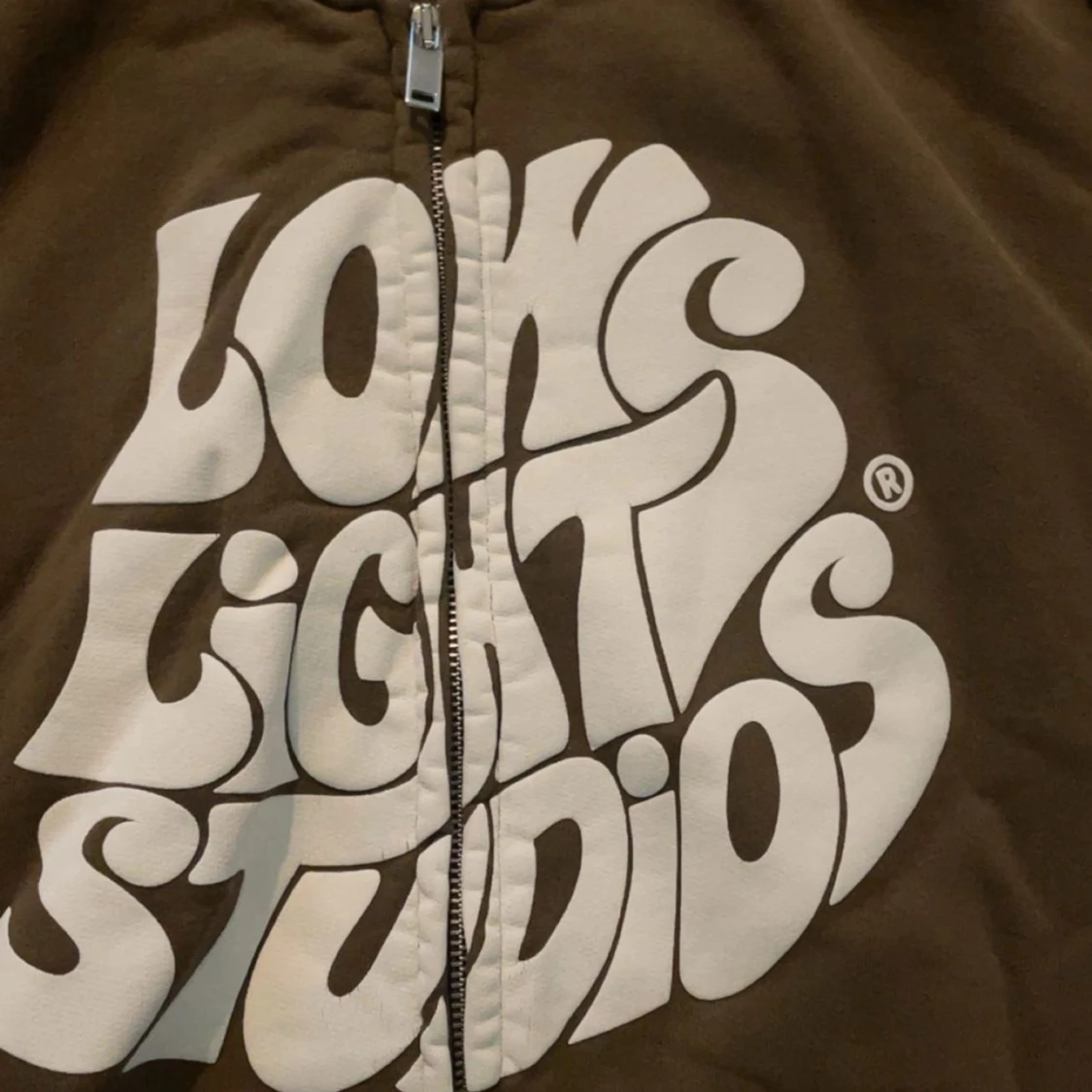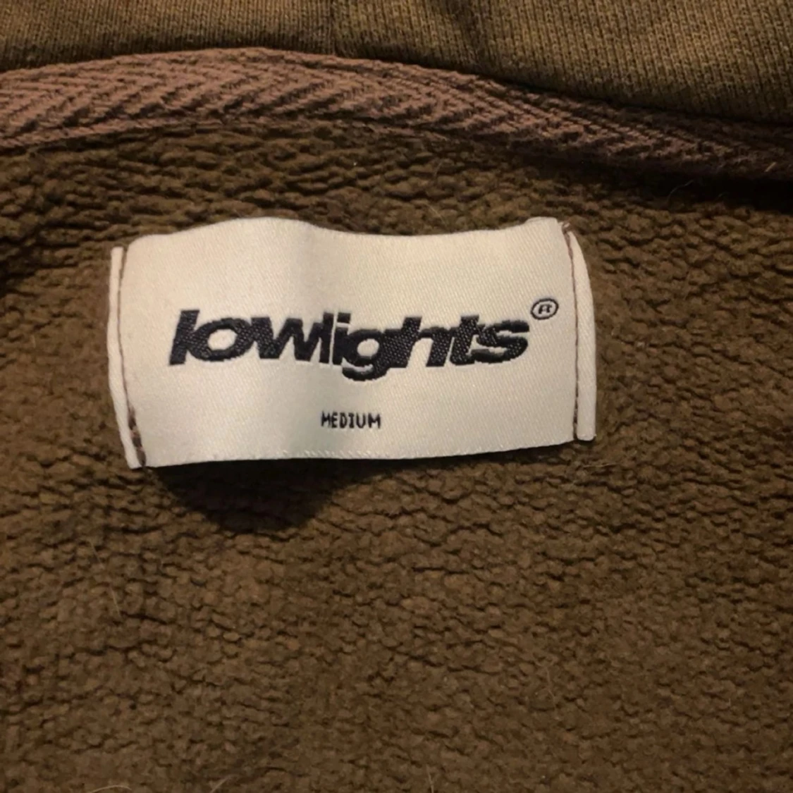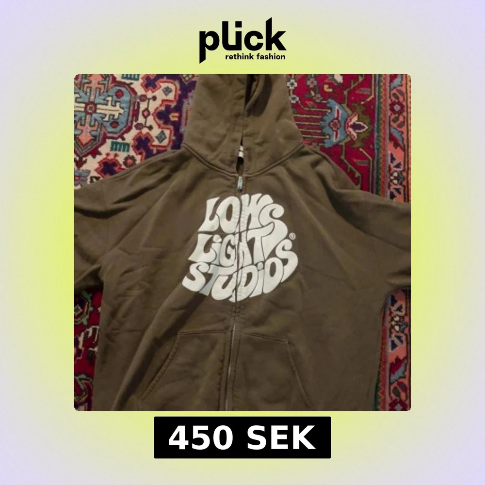 Brun hoodie från Lowlights Studios i storlek medium med stor vit grafisk logga på framsidan. Tröjan har huva, dragkedja och två fickor framtill. Mjuk insida och klassisk streetwear-look, perfekt för chill dagar.