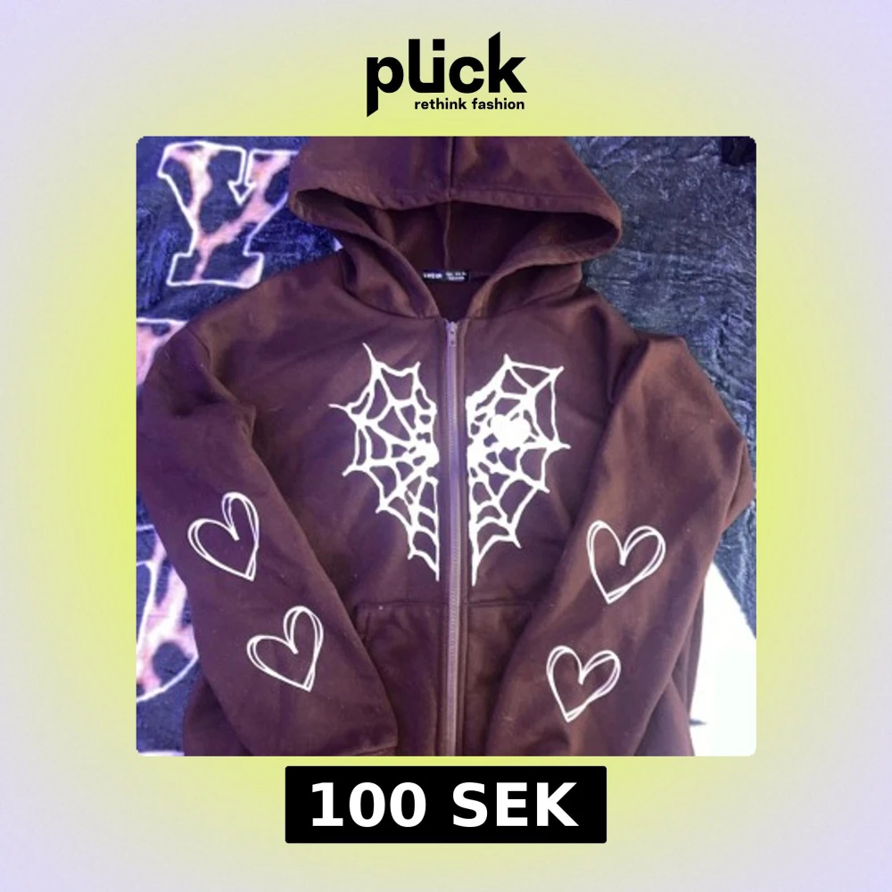 Brun hoodiejacka från SHEIN med dragkedja, vita tryck av spindelnät och hjärtan på bröstet och ärmarna. Jackan har huva och är långärmad, perfekt för dig som gillar en edgy och söt stil.