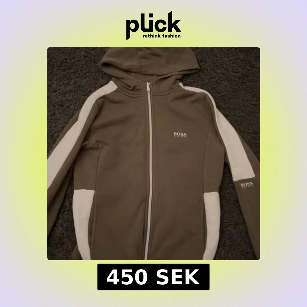 Säljer en brun huvtröja från Boss med dragkedja och vita detaljer längs ärmarna. Perfekt för en avslappnad stil. Tröjan har en huva och är långärmad.