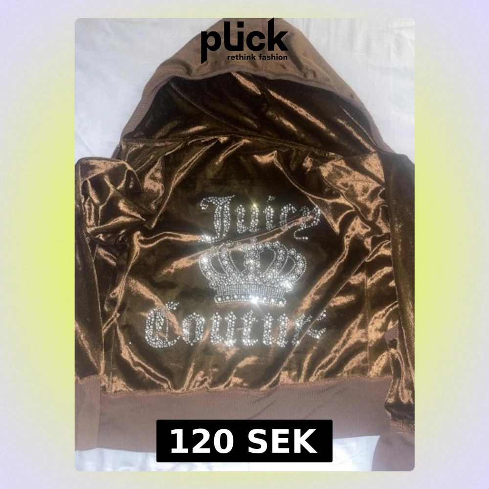 Säljer en brun glansig hoodie från Juicy Couture i mjuk velour med strassdetaljer på ryggen och ärmen. Jackan har huva, ribbade muddar och dragkedja framtill. Ikonisk krona och logga i strass på ryggen för extra bling.