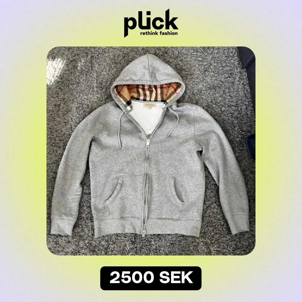 Säljer en snygg grå huvtröja från Burberry med klassiskt rutigt foder i huvan. Tröjan har dragkedja och två fickor fram. Perfekt för höst och vår, och den är i mycket bra skick. Passar både till vardags och lite mer avslappnade tillfällen.