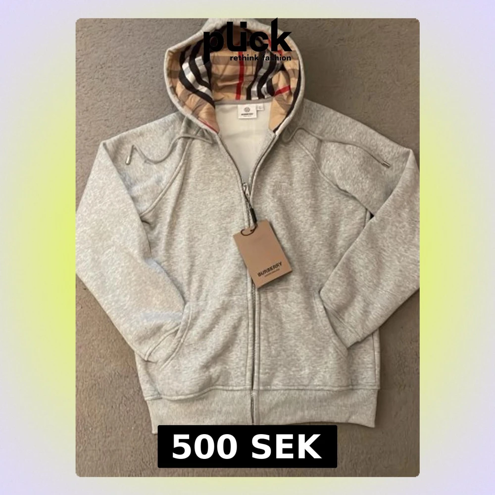 Snygg grå hoodie från Burberry med dragkedja och klassiskt rutigt foder i huvan. Mjuk bomullsmix, ribbade muddar och fickor framtill. Perfekt för en stilren och avslappnad look.