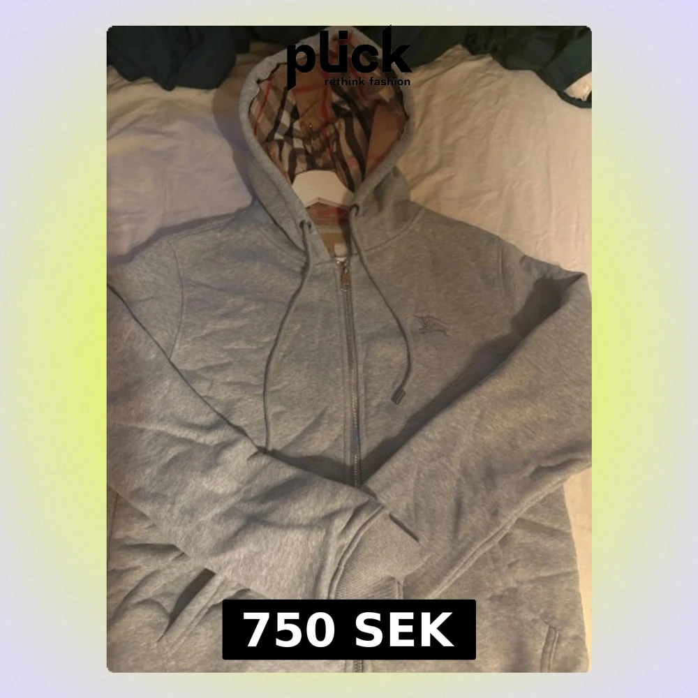 Säljer en grå hoodie från Burberry i storlek M. Tröjan har dragkedja, snörning vid huvan och Burberrys klassiska rutiga mönster på insidan av huvan. Broderad logga på bröstet och två fickor framtill. Perfekt för dig som vill ha en stilren och lyxig look. Passar även S