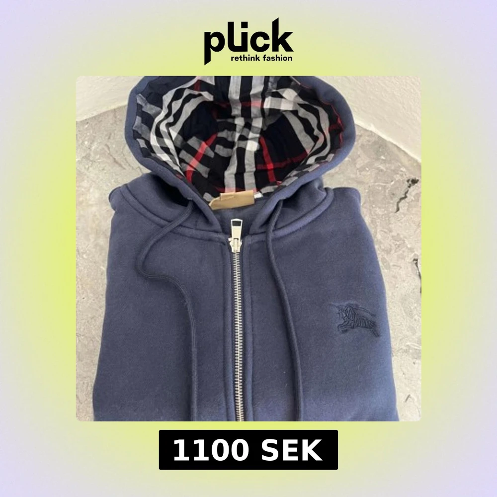 Säljer en snygg blå huvtröja från Burberry med dragkedja och broderad logga på bröstet. Insidan av huvan har ett klassiskt rutigt mönster i svart, vitt och rött. Perfekt för en stilren look. Pris går även att diskutera