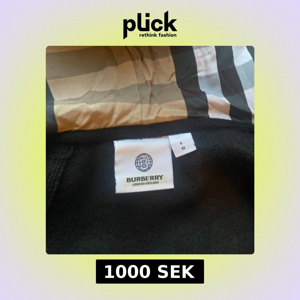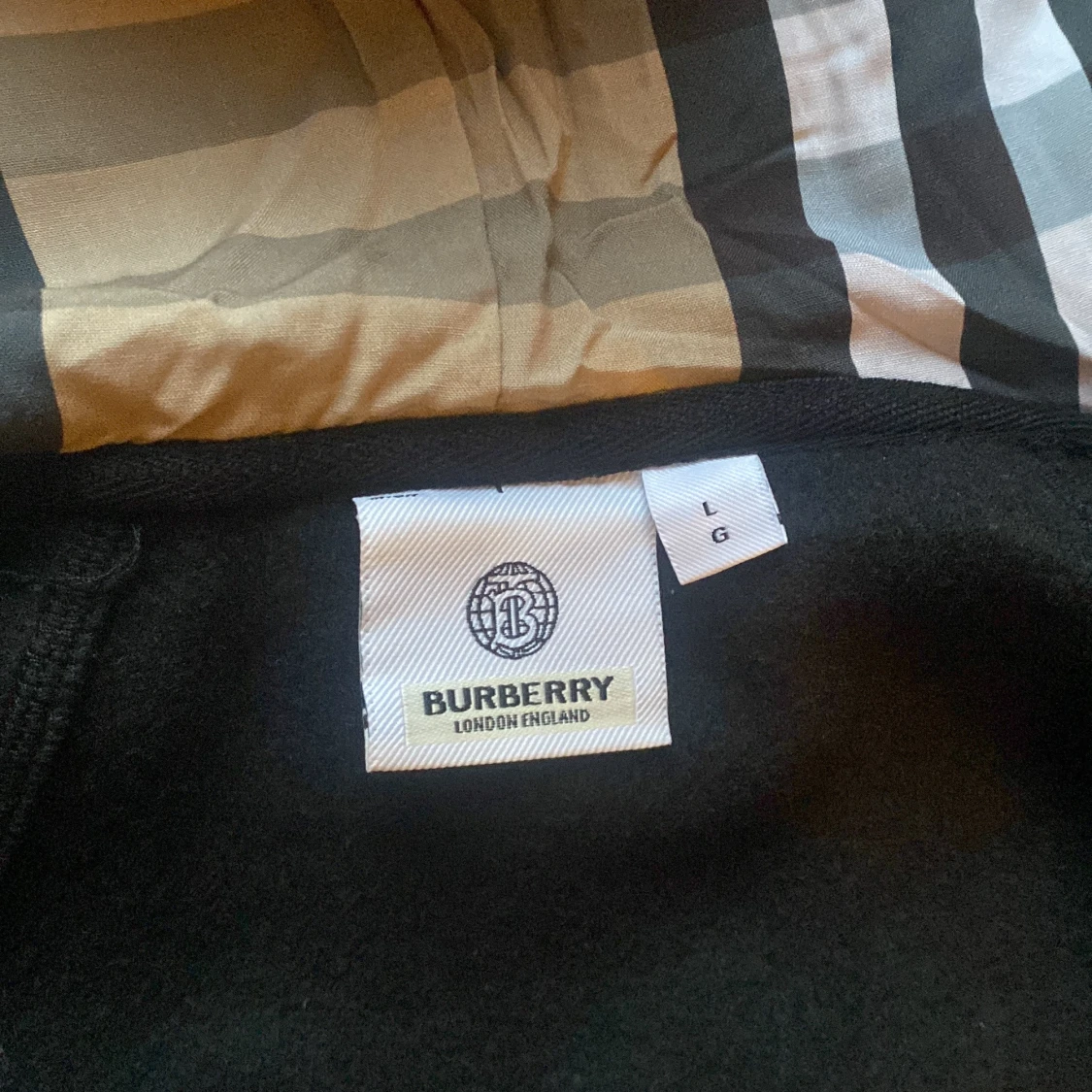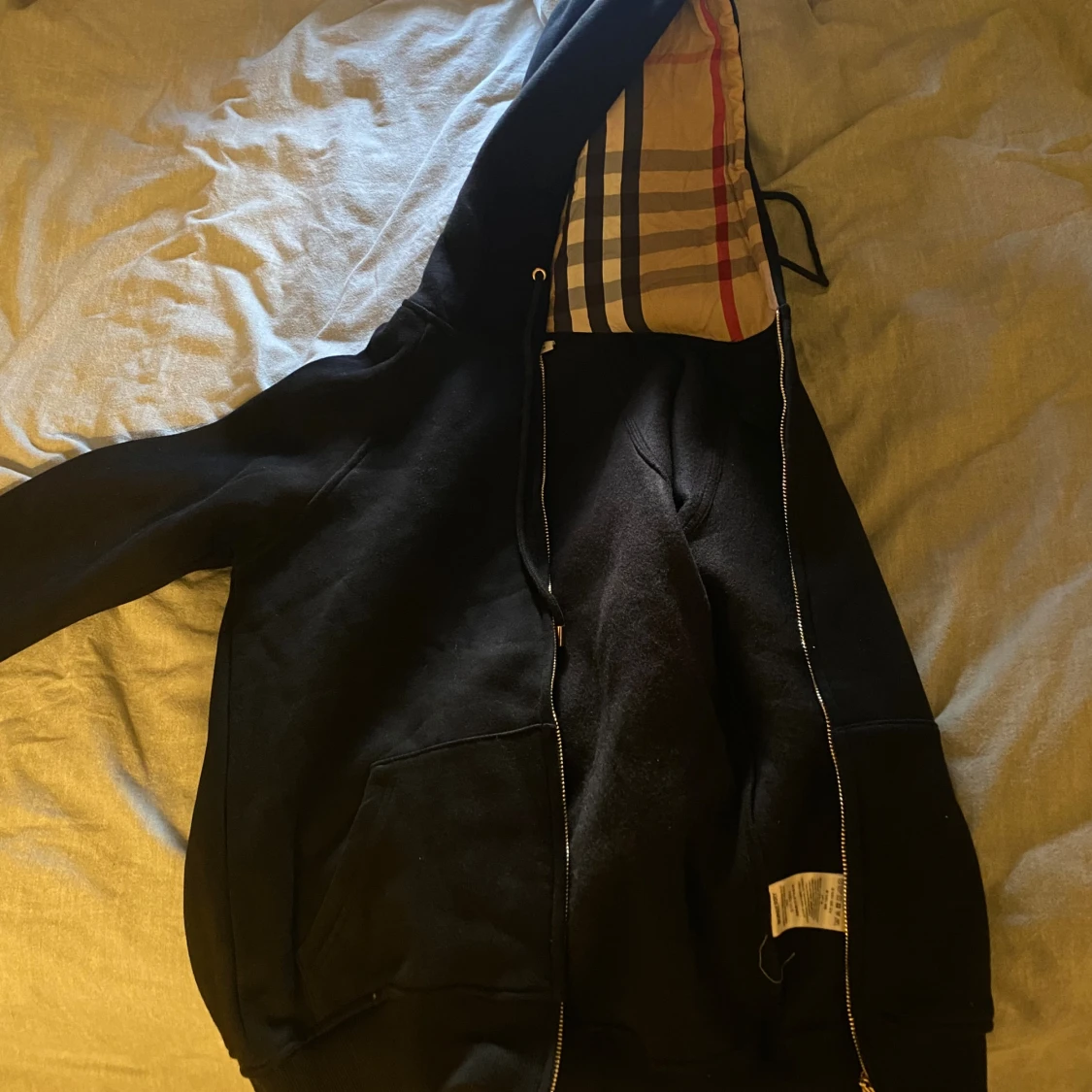 Svart hoodie från Burberry med klassiskt rutigt foder i huvan. Jackan har dragkedja framtill, snörning i huvan och två fickor. Tillverkad i mjuk bomull och har en stilren, tidlös look med exklusiva detaljer. Det står att den är L fast den passar S