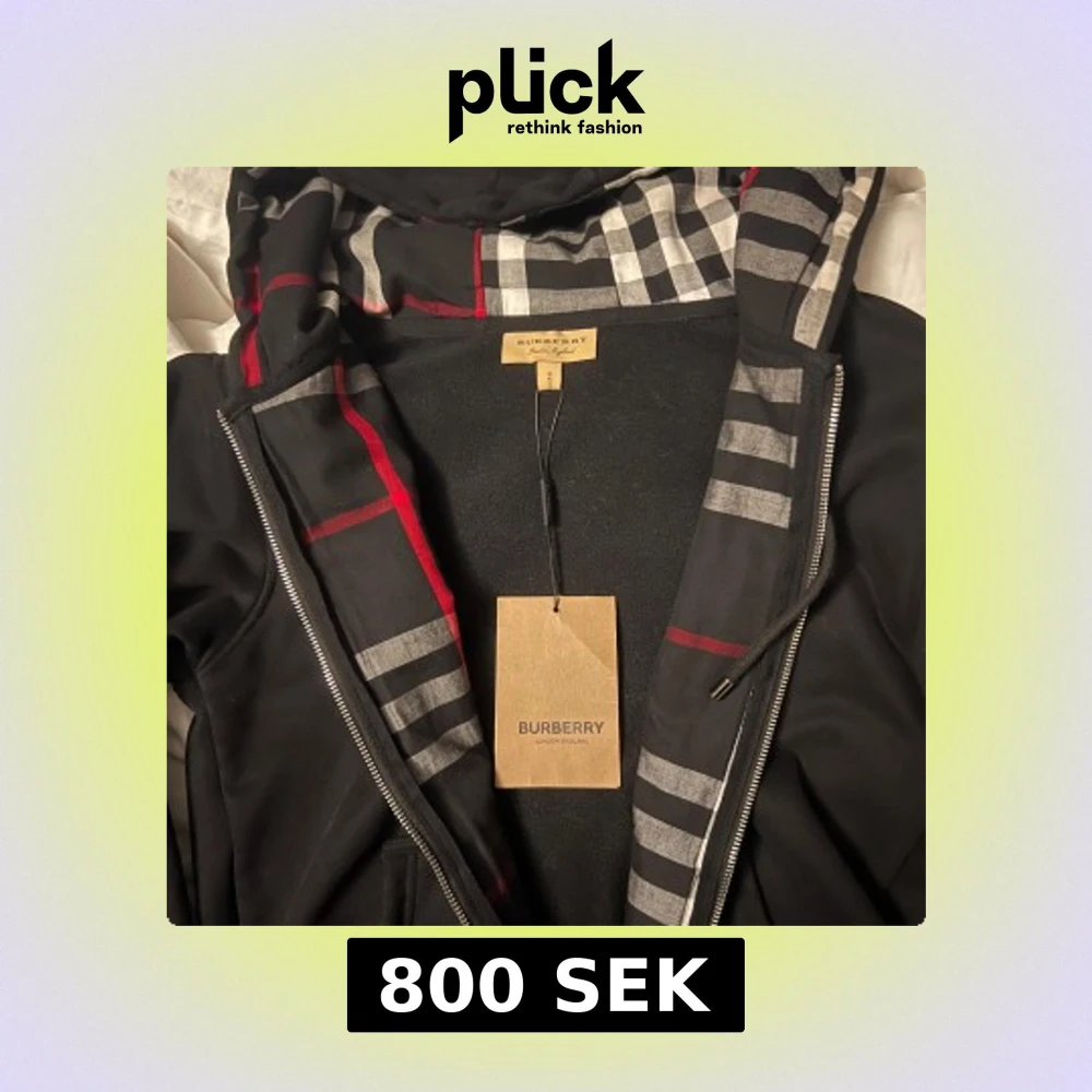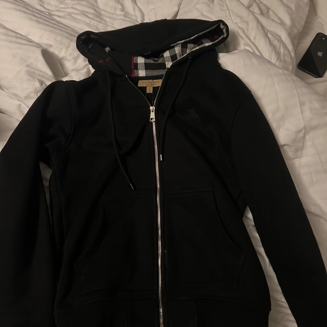 Snygg svart hoodie från Burberry med klassiskt rutigt mönster i huvan. Den har dragkedja framtill och en justerbar huva med snörning. Perfekt för en stilren look.