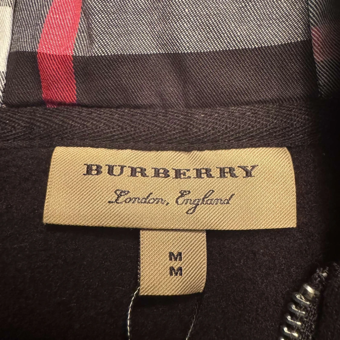 Säljer en stilren svart huvtröja från Burberry med dragkedja och klassiskt rutigt foder i huvan. Tröjan har en broderad logga på bröstet och ribbade muddar vid ärmslut och nederkant. Perfekt för en casual look!