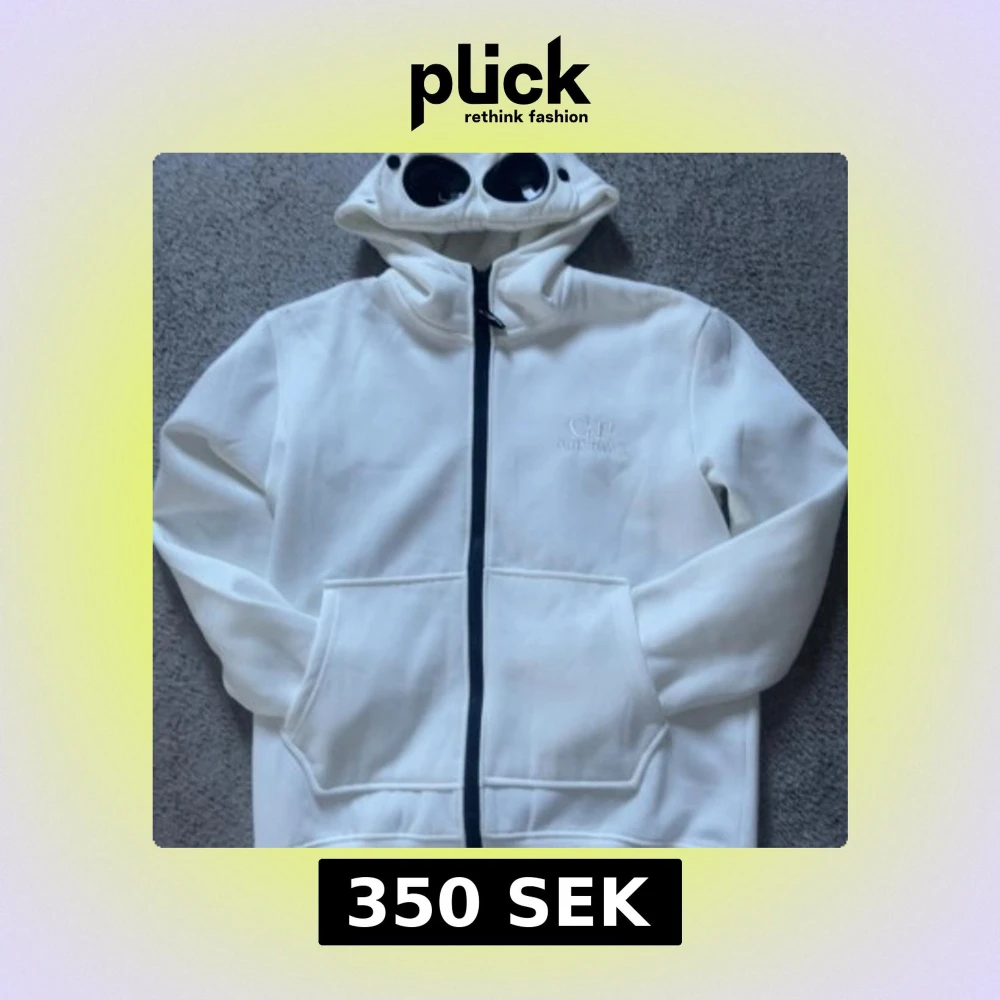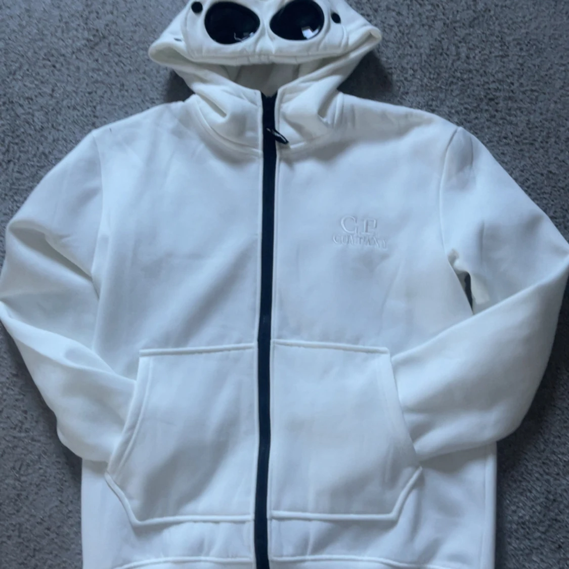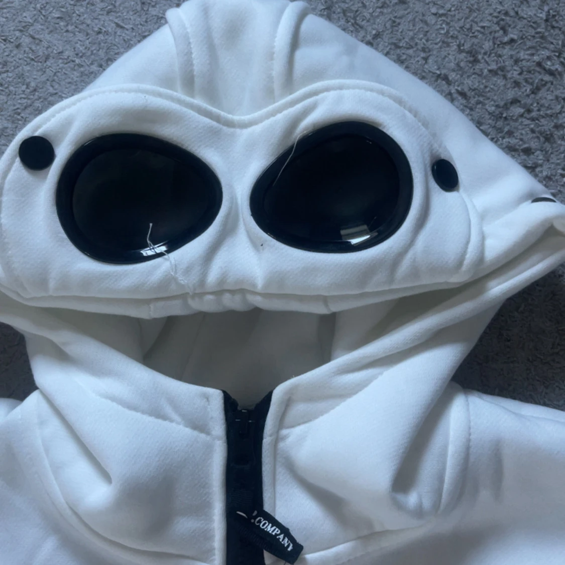 Vit gogglejacka från C.P. Company med ikoniska svarta glasögon i huvan och broderad logga på bröstet. Jackan har dragkedja framtill, två stora fickor och är tillverkad i mjukt material. Perfekt för dig som vill sticka ut med en unik streetwear-look.tröjan är inte äkta och det är en knapp som har lossnat men det är inget som syns