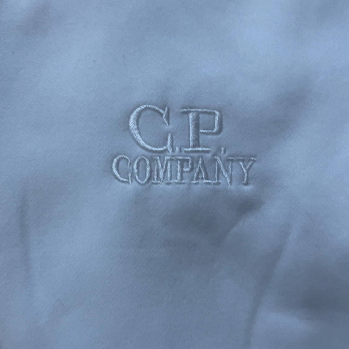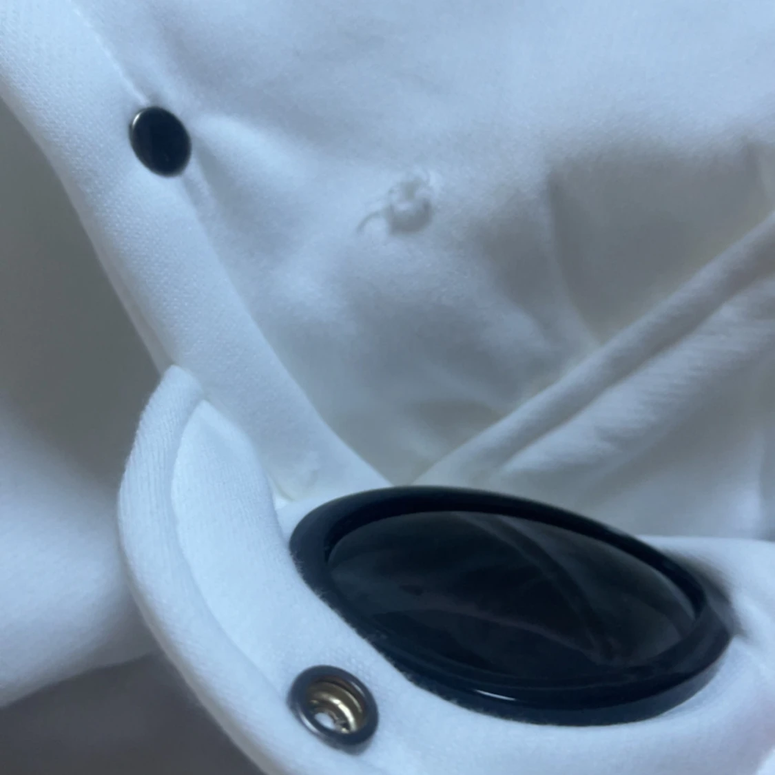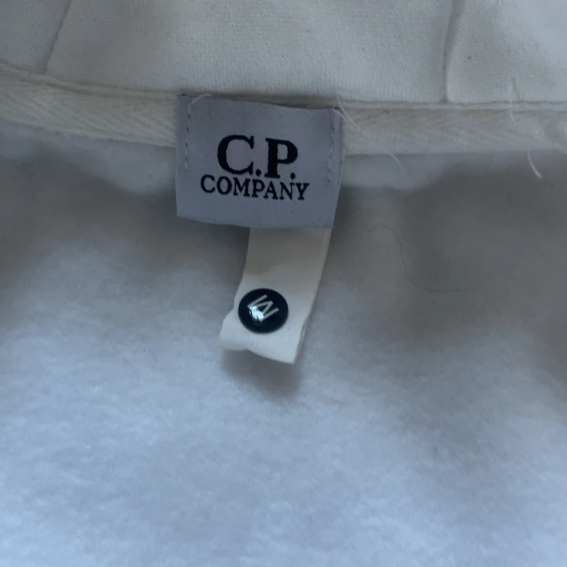 Vit gogglejacka från C.P. Company med ikoniska svarta glasögon i huvan och broderad logga på bröstet. Jackan har dragkedja framtill, två stora fickor och är tillverkad i mjukt material. Perfekt för dig som vill sticka ut med en unik streetwear-look.tröjan är inte äkta och det är en knapp som har lossnat men det är inget som syns