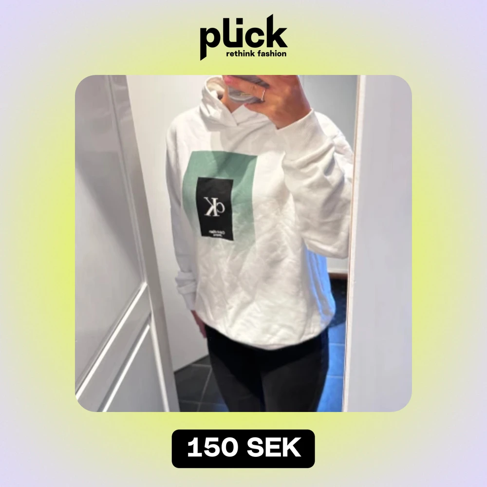 Vit hoodie från Calvin Klein med tryck på. Passar super bra till en fin sommarkväll! Storlek 14år. Jag har storlek 158 i vanliga fall och passar mig bra. Hoodien är knappt använd utan bara legat i en låda. Nypris 899kr