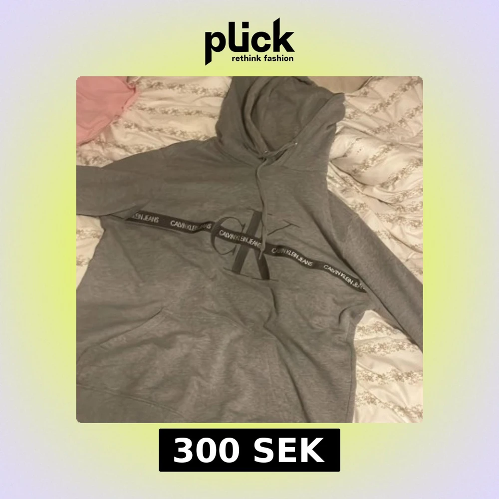 Säljer en grå hoodie från Calvin Klein Jeans i storlek XL. Tröjan har stor CK-logga och svart band med text över bröstet, samt broderad CK-detalj på ärmen. Klassisk känguruficka och huva med snörning. Perfekt för chill dagar.