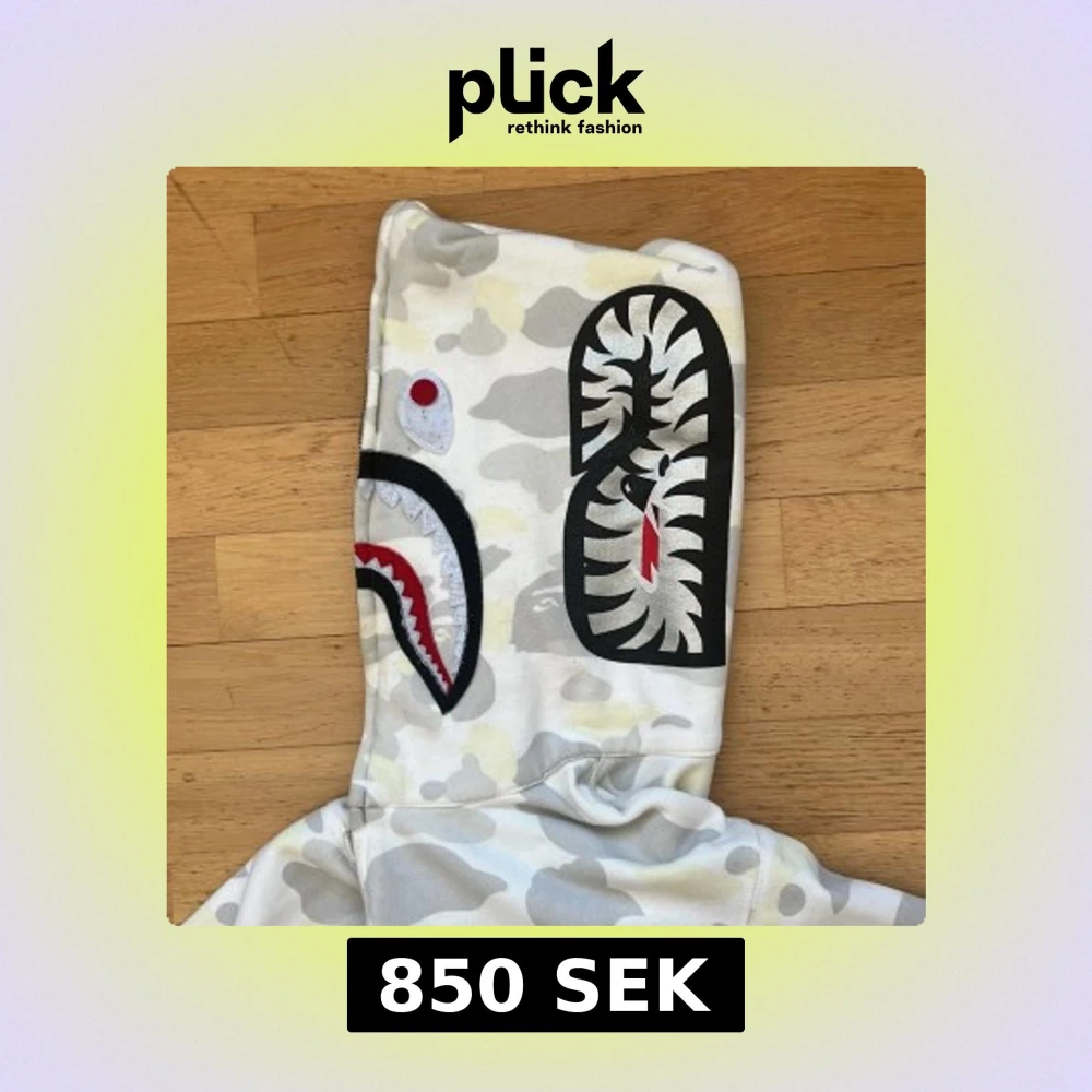 Säljer en BAPE zip hoodie i vit och grå camo med hajmotiv på huvan. Hoodien har dragkedja hela vägen upp, två fickor fram och detaljerade broderier på huvan. Ikonisk streetwear-stil och coolt camomönster. Perfekt för dig som vill sticka ut.
