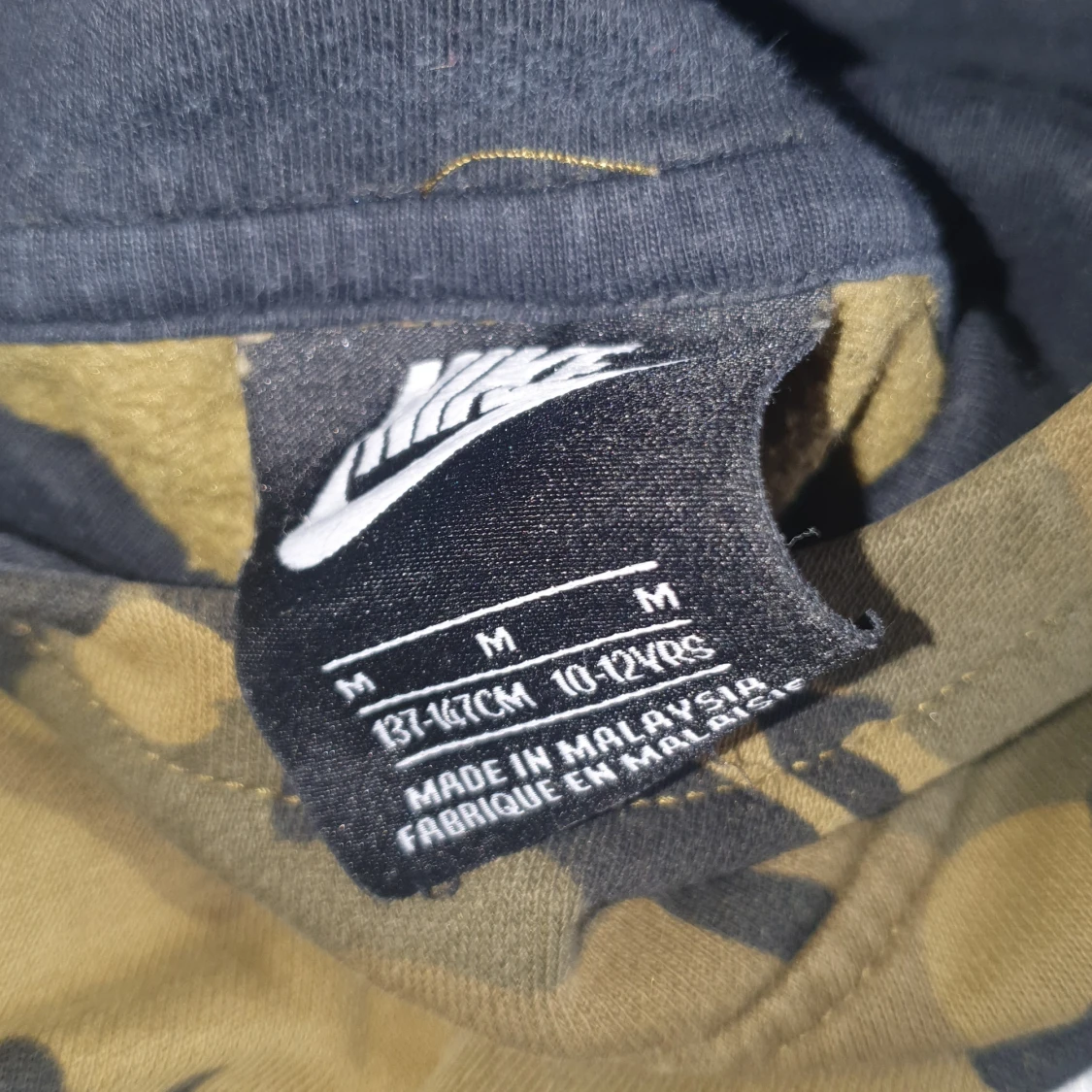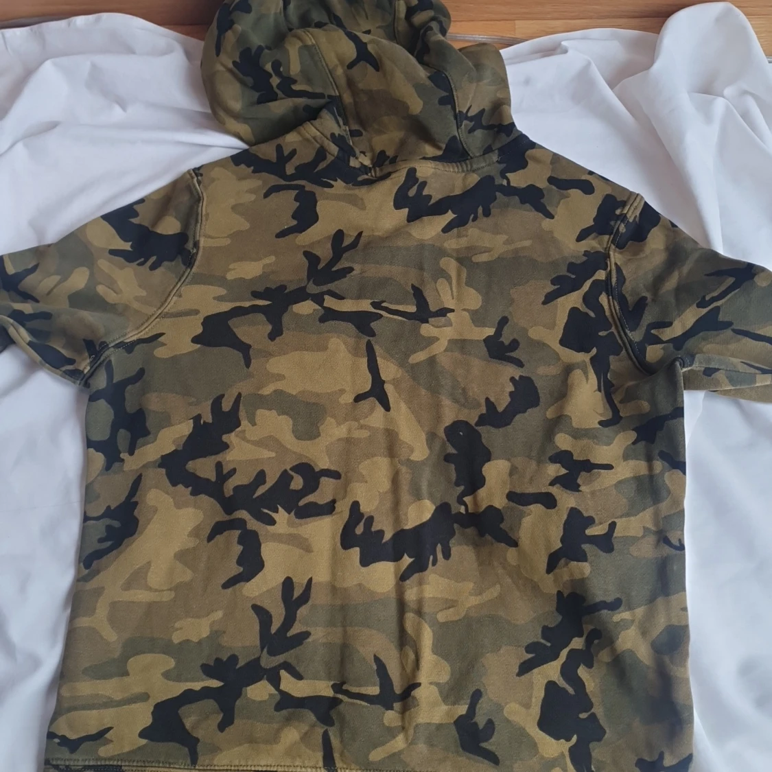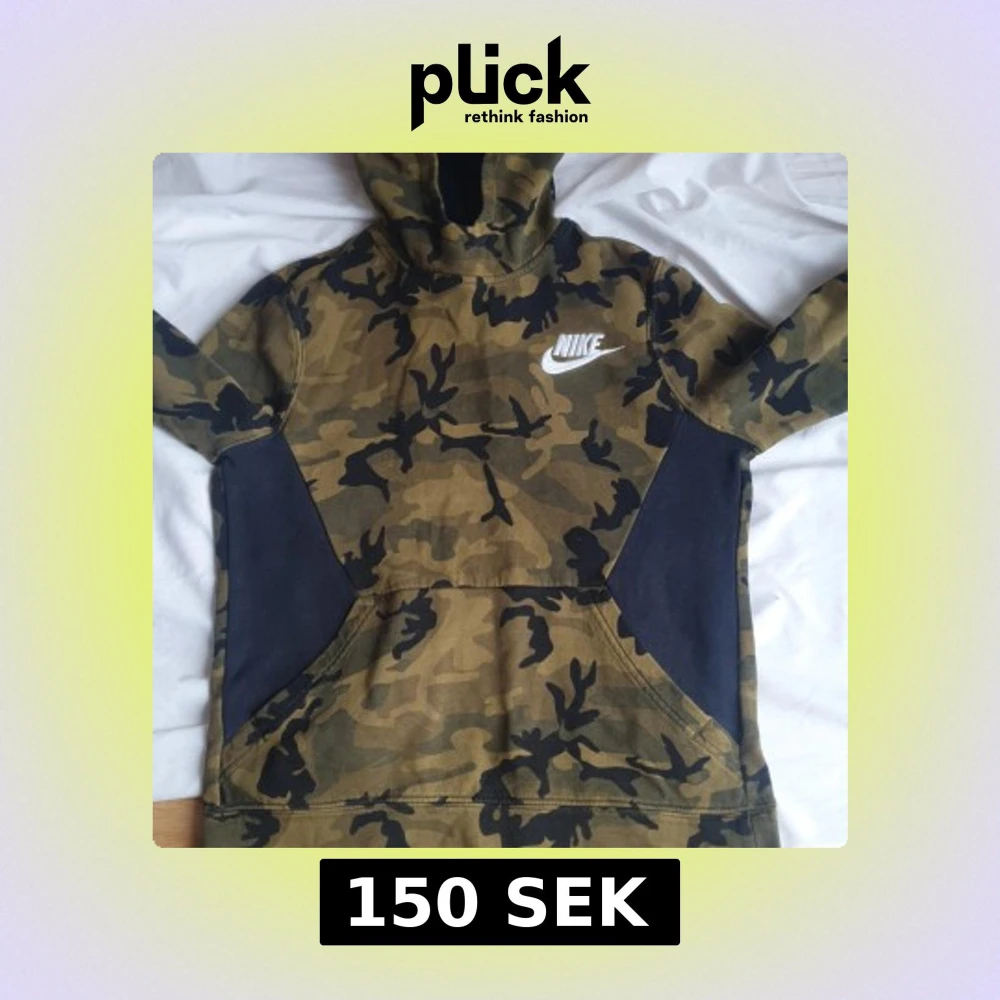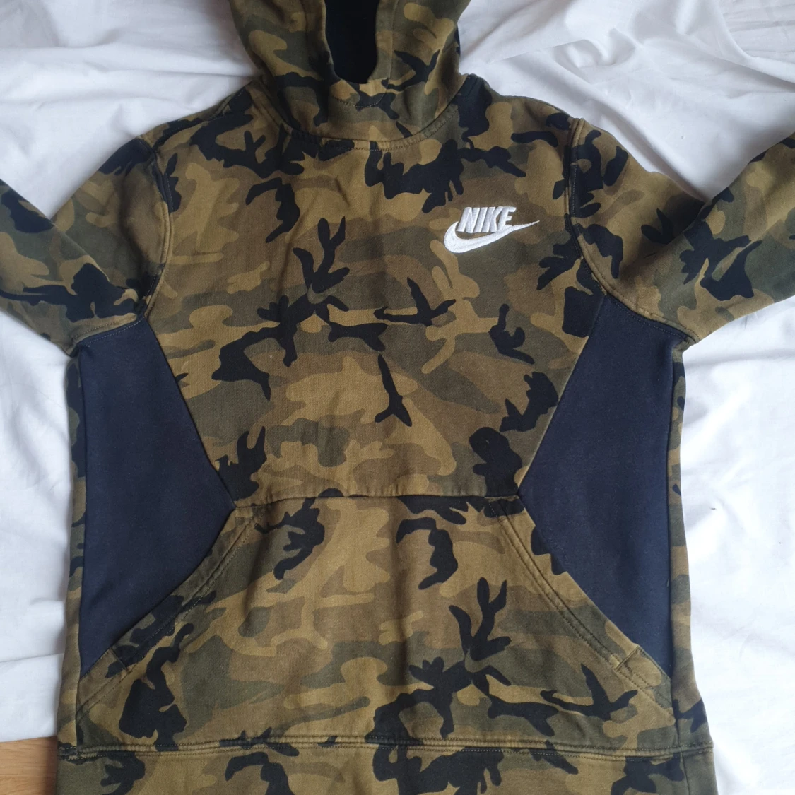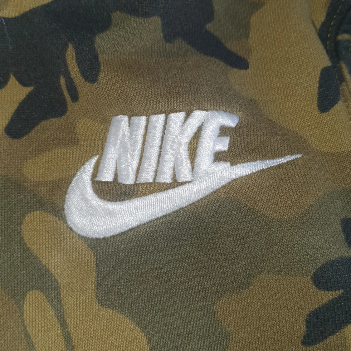 Säljer en Nike hoodie i camouflage med broderad vit logga på bröstet. Tröjan har huva, lång ärm och känguruficka framtill. Materialet är mjukt och bekvämt, perfekt för en avslappnad stil.