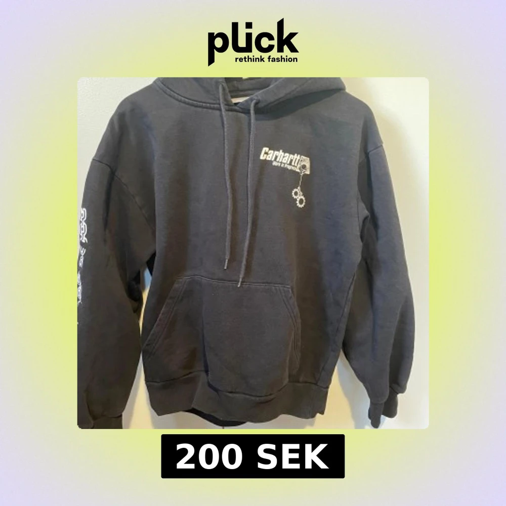 Säljer en svart hoodie från Carhartt med tryck på både fram- och baksida samt ärmarna.