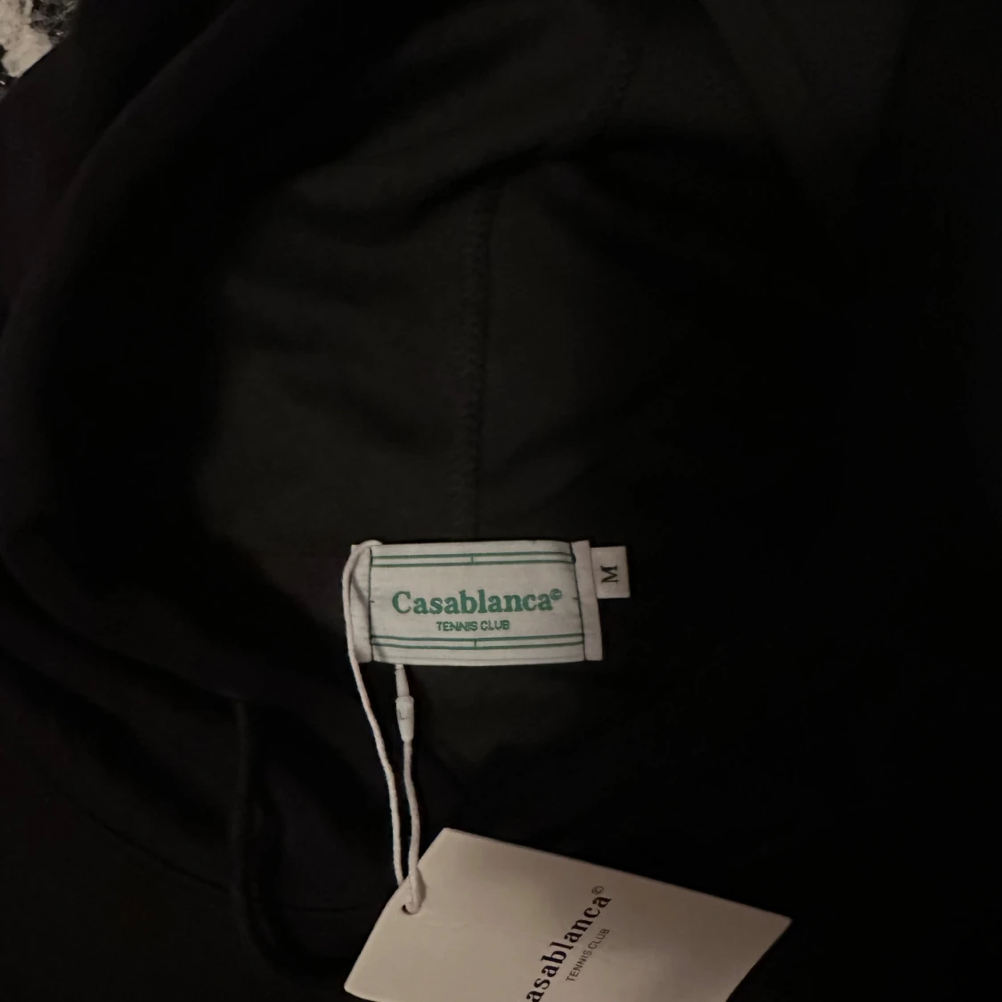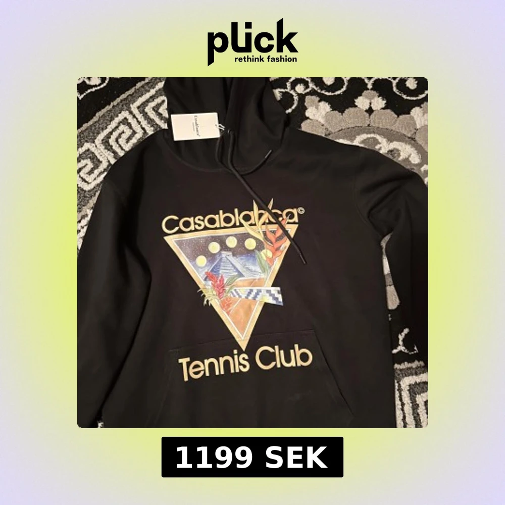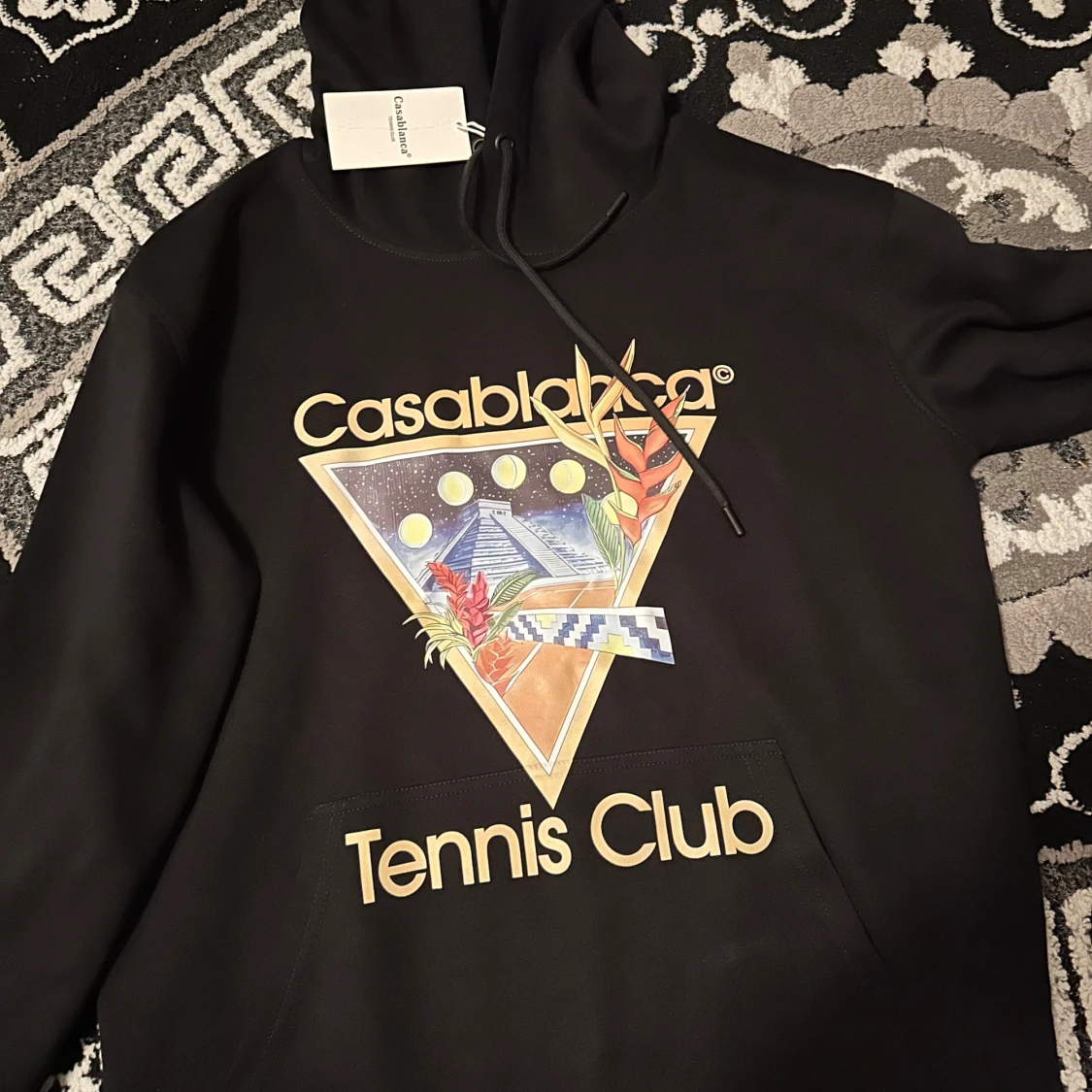 Säljer en exklusiv Casablanca Tennis Club-huvtröja i svart. Denna hoodie är dekorerad med en unik grafisk print som inkluderar en triangel, pyramid, himlakroppar, tropiska växter och en tennisbana. Den har också en liten Casablanca Tennis Club-tagg på insidan av huvan. Tröjan är i utmärkt skick, knappt använd och perfekt för både vardagsbruk och sportiga tillfällen. Storlek: [M].