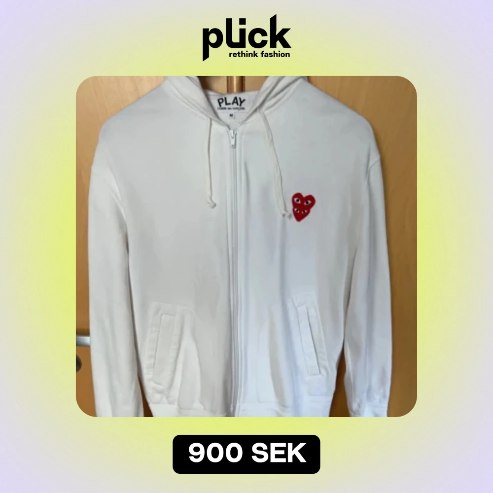Tja, säljer en fräsch CDG hoodie i strl M kan passa S med. Ser ut som ny inga fel eller fläckar. Äkta såklart