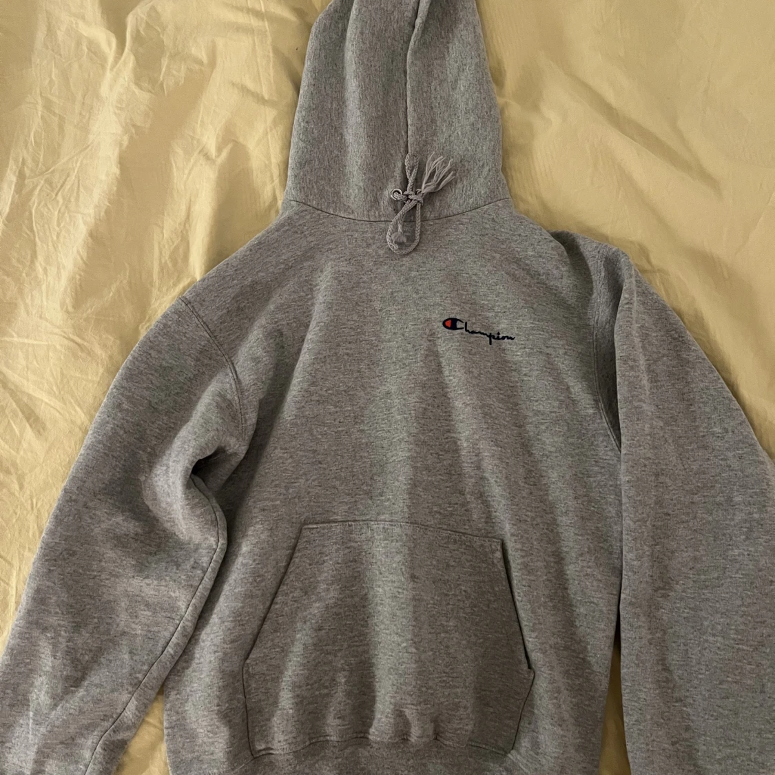 En grå champion hoodie med skönt material. Skicket är bra, den är köpt second hand men knappt använd.
