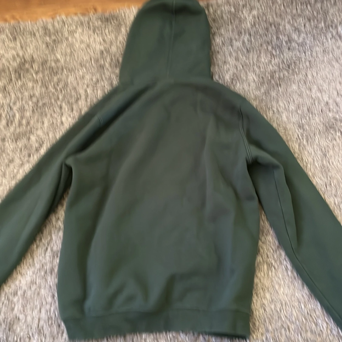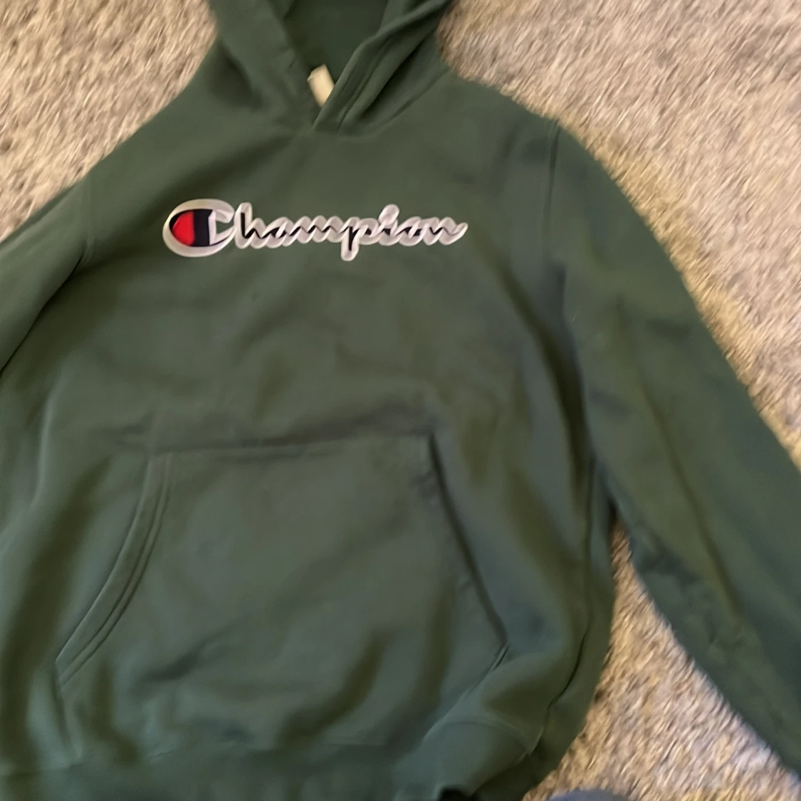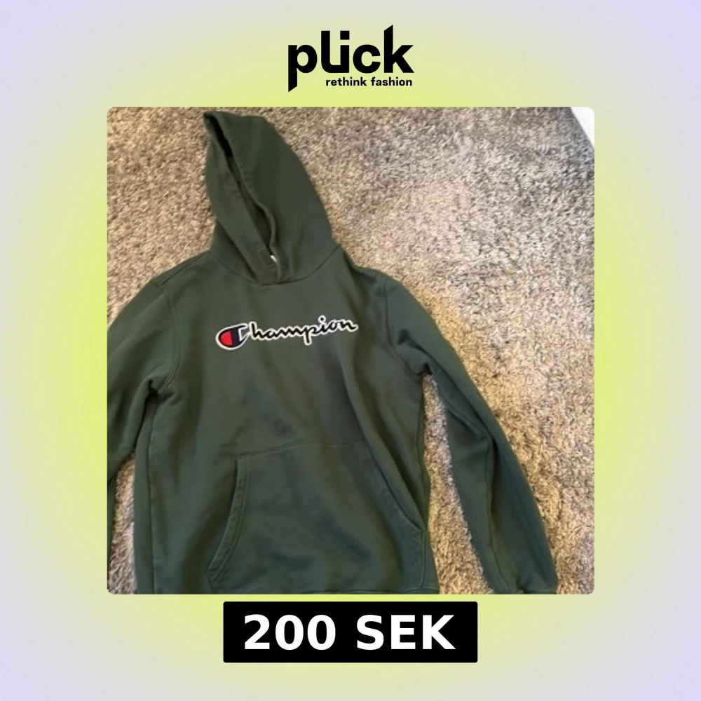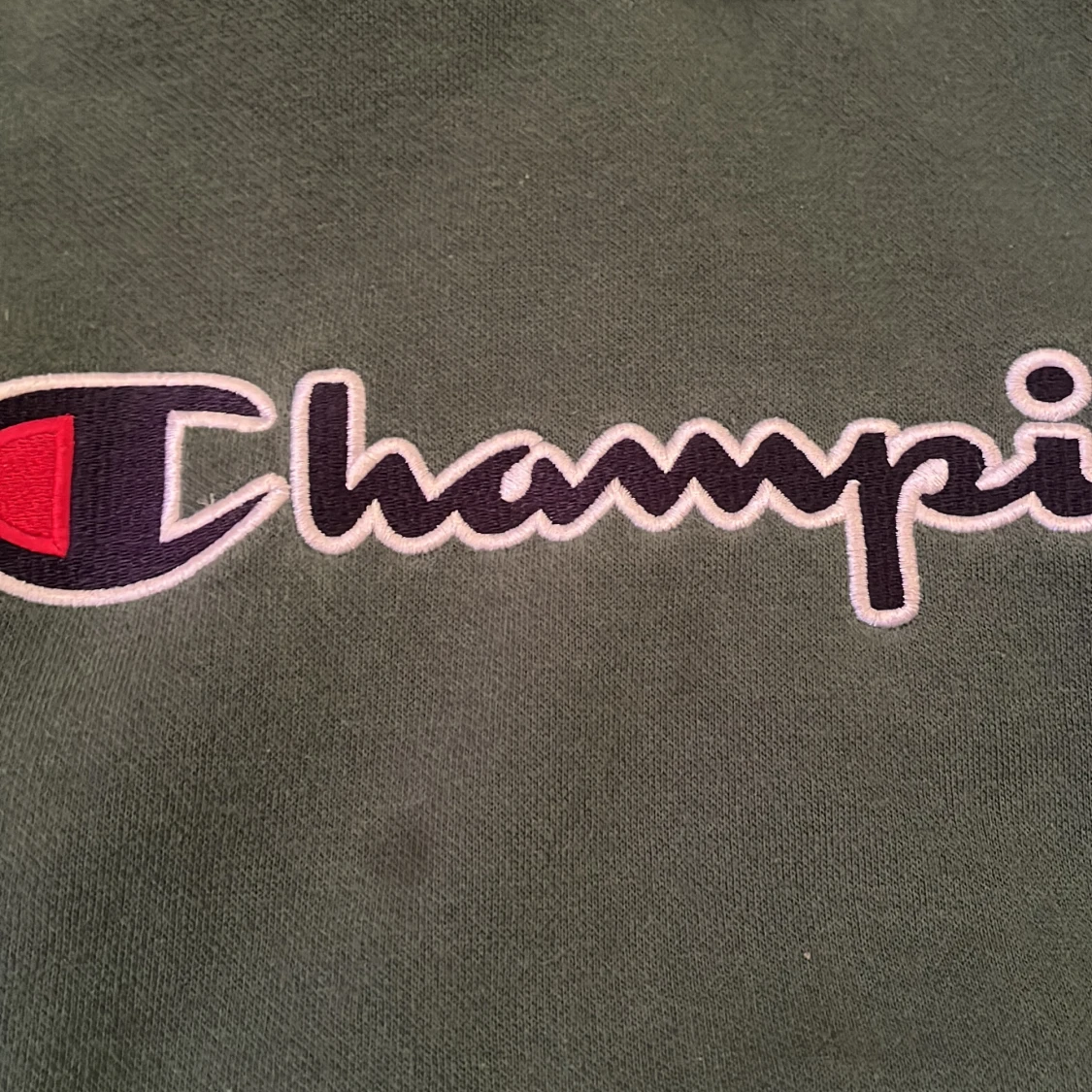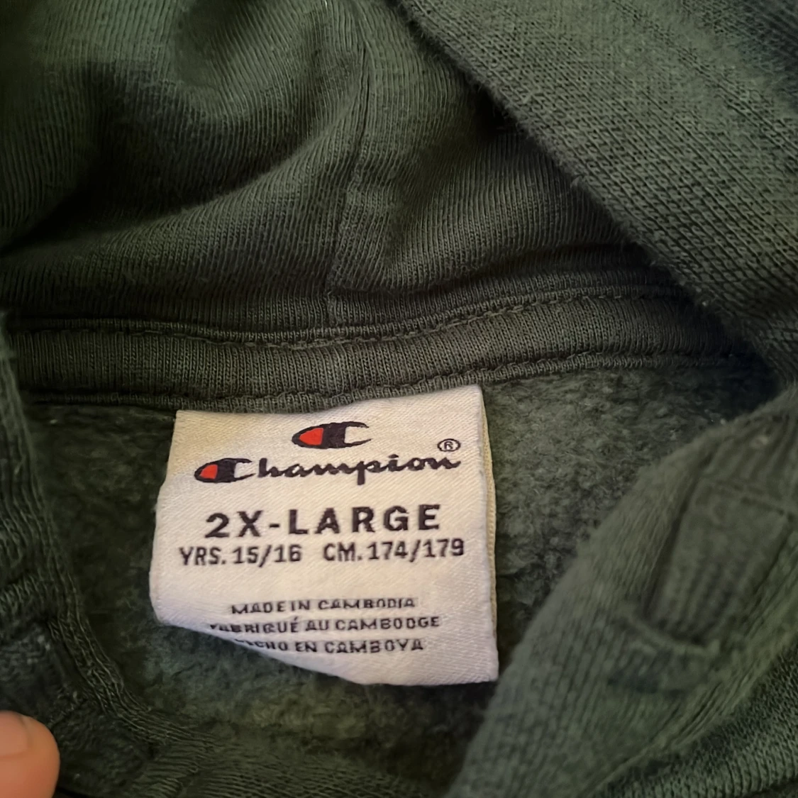 Säljer en mörkgrön hoodie från Champion i storlek 2X-Large. Tröjan har klassisk huva, magficka och stort broderat Champion-logo på bröstet. Perfekt för en avslappnad stil och enkel att matcha med jeans eller joggers.