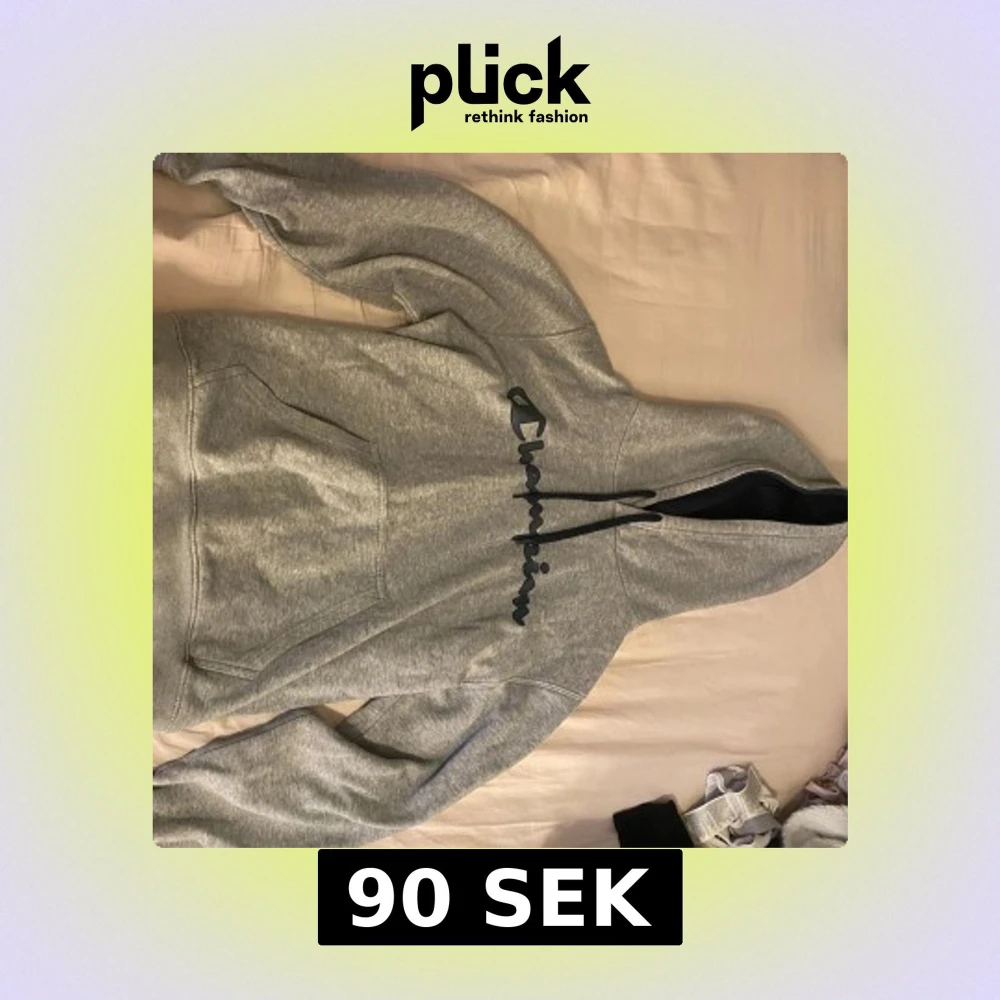 Säljer en grå hoodie från Champion med svart logga på bröstet. Tröjan har en klassisk design med känguruficka och justerbar huva. Perfekt för en avslappnad stil.
