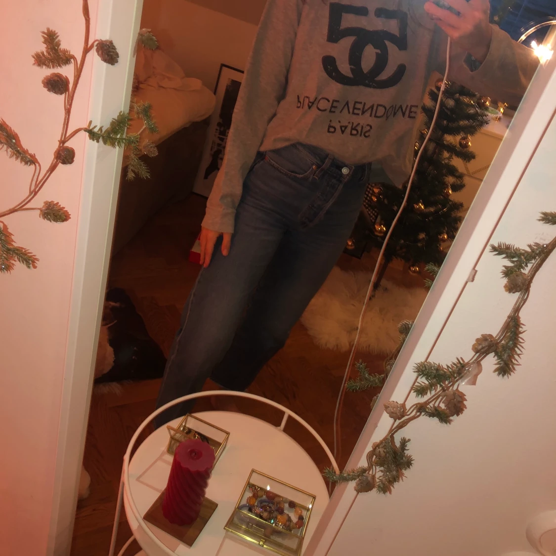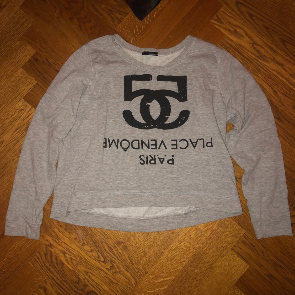 En grå mysig tjocktröja med Chanel tryck på. Köparen betalar frakt 😎