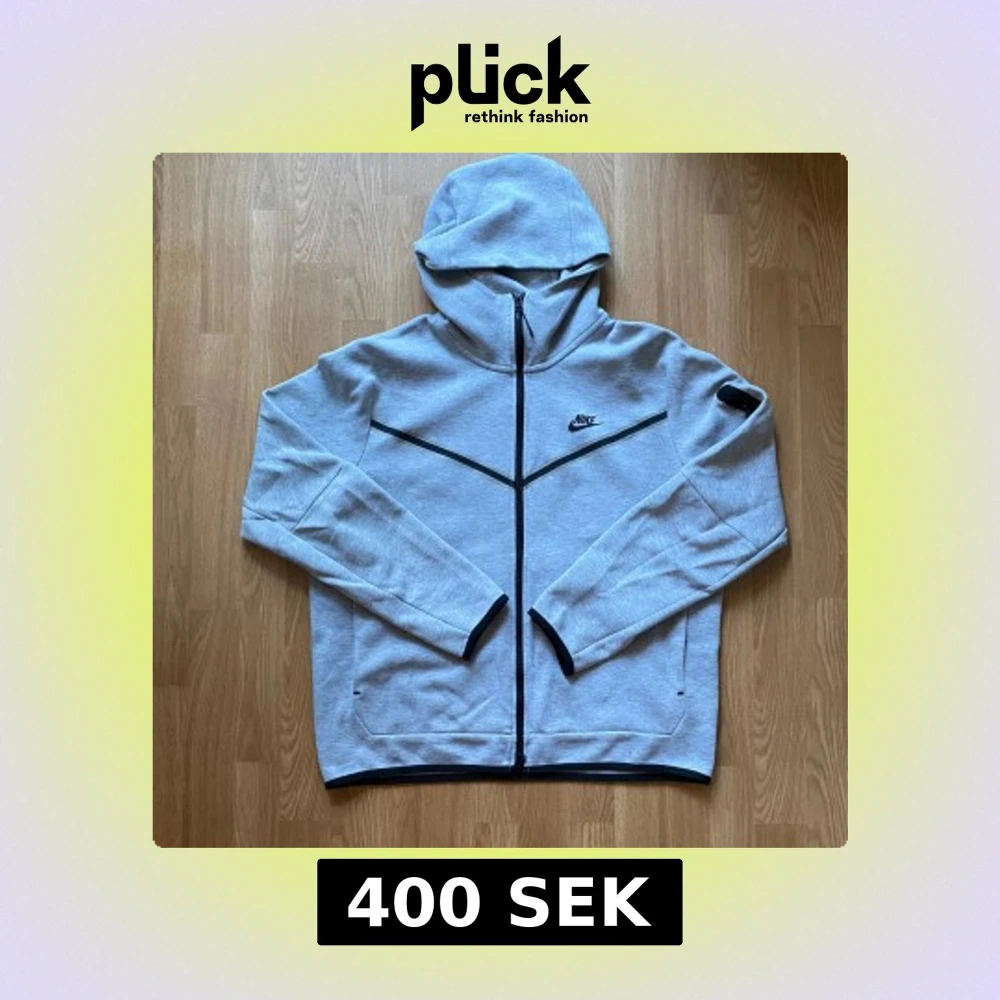 Nike Tech Fleece hoodiejacka i ljusgrått med svart logga på bröstet och hel dragkedja. Jackan har huva, svarta detaljer längs dragkedjan och ärmslut samt en praktisk ficka med dragkedja på ena ärmen. Perfekt för chill eller träning. Köptes för 1300kr