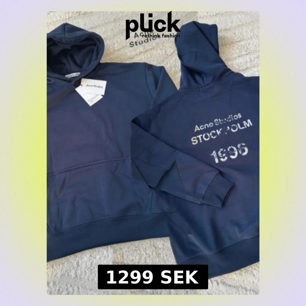 Snygg mörkblå hoodie från Acne Studios med klassisk huva och magficka. På ryggen står det 'Acne Studios STOCKHOLM 1996' i vitt tryck. Tillverkad i mjuk bomullsblandning och har ribbade muddar vid ärmslut och nederkant. Perfekt för en avslappnad men ändå fräsch look.