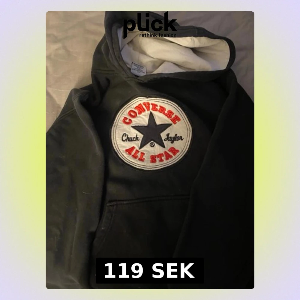 Säljer en svart hoodie från Converse med det klassiska All Star-märket broderat på bröstet i vitt, rött och svart. Hoodien har en stor ficka framtill och vit insida i huvan. Perfekt för dig som gillar streetwear och vill ha en ikonisk look.