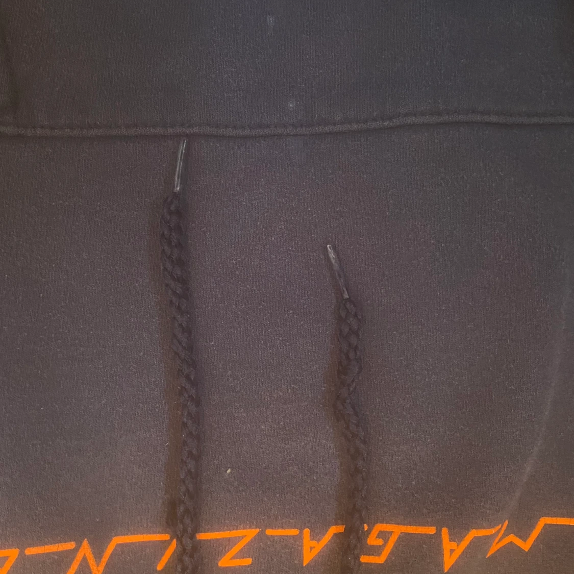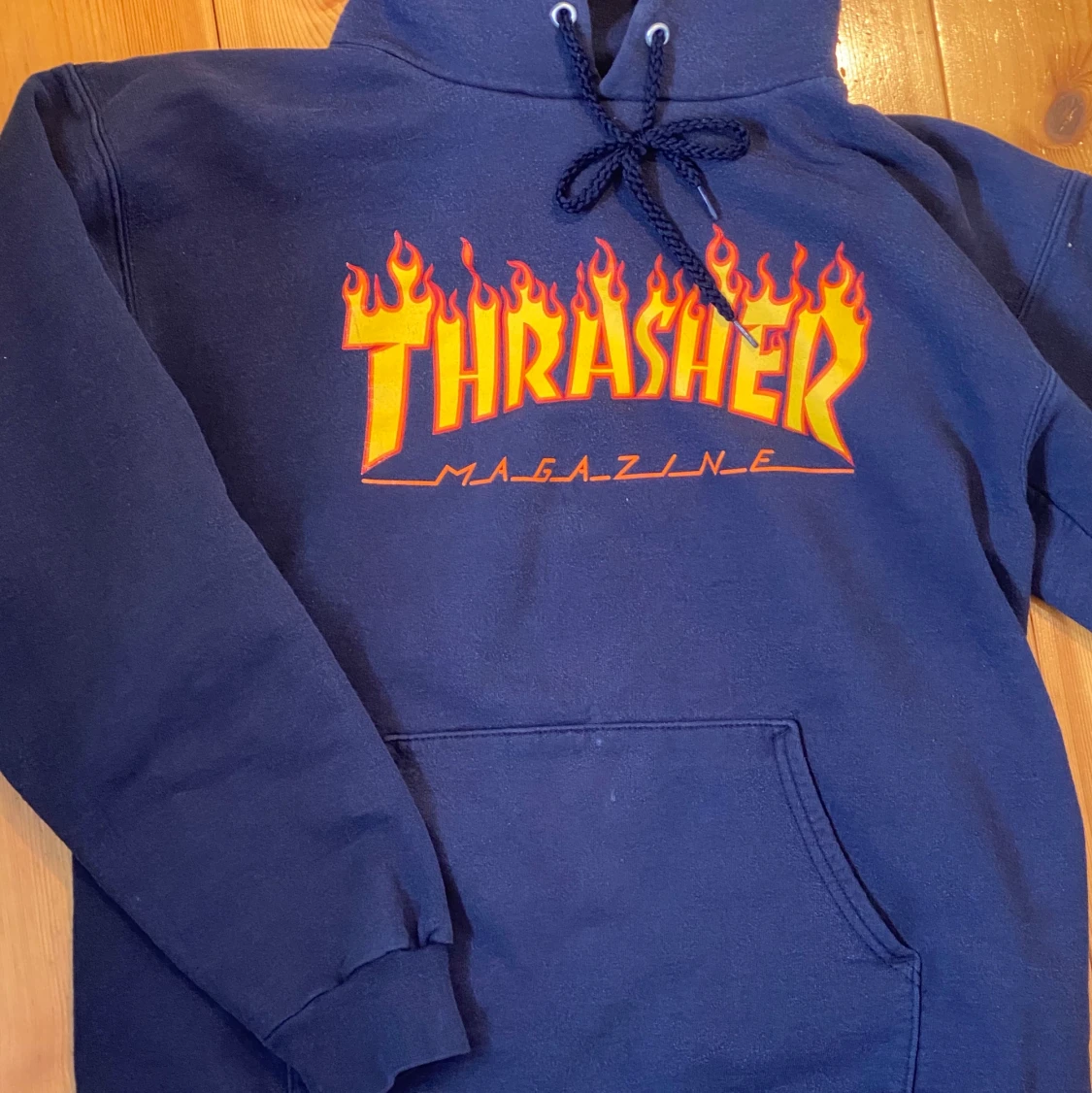 Marinblå äkta trasherhoodie jag köpt 2 år sen. Den är ganska urtvättad vilket gör den mer hård typ, och den är inte sådär mysig som nya hoodies brukar vara. Vid fickan så finns det 2 små vita fläckar och snörena är också lite defekta. 👕 + frakt