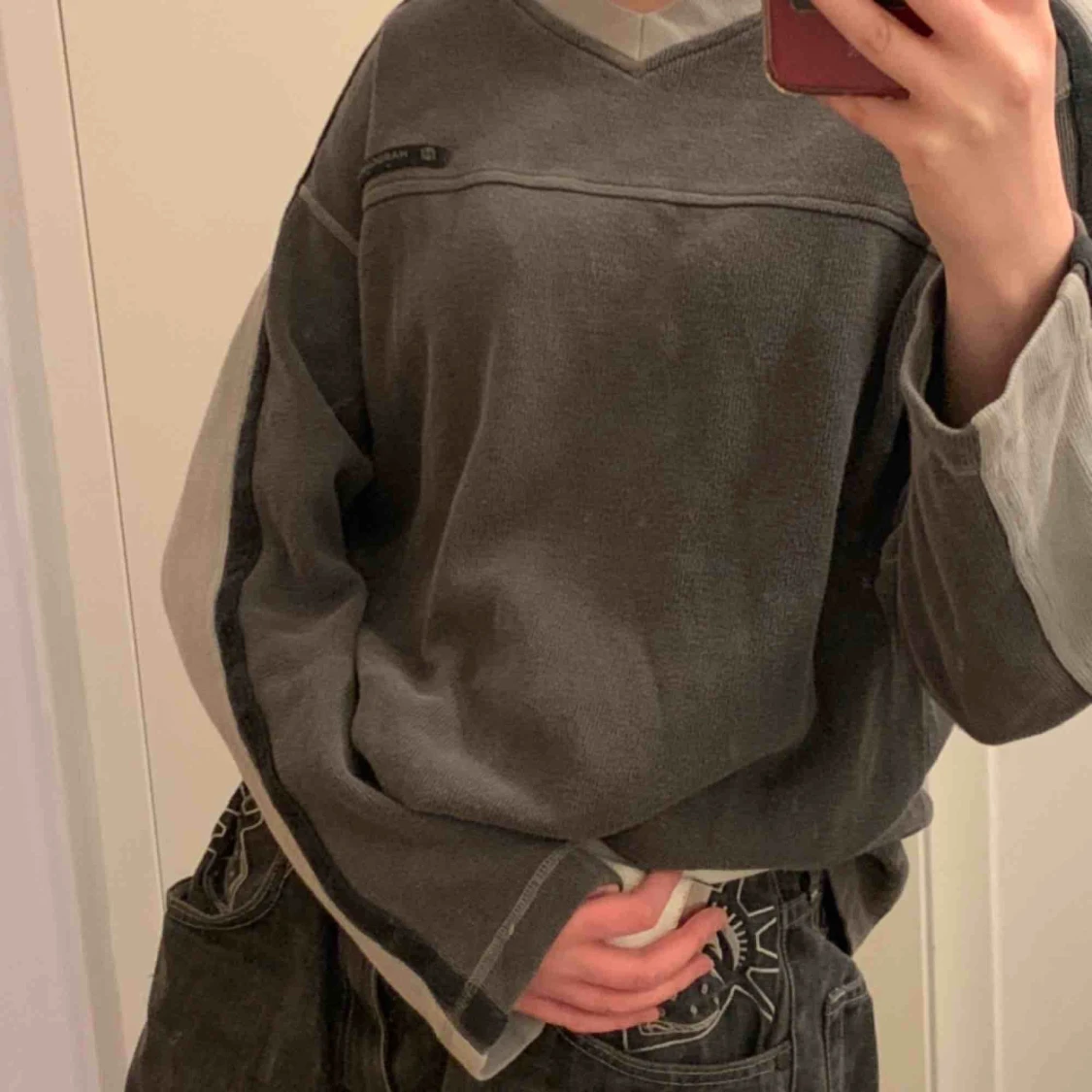 Grå typ sweatshirt eller tjocktröja. Bra skick. Har ett litet märke på bröstet som läser ”hardcore”. Streck på ärmarna med 3 olika nyanser av grå.