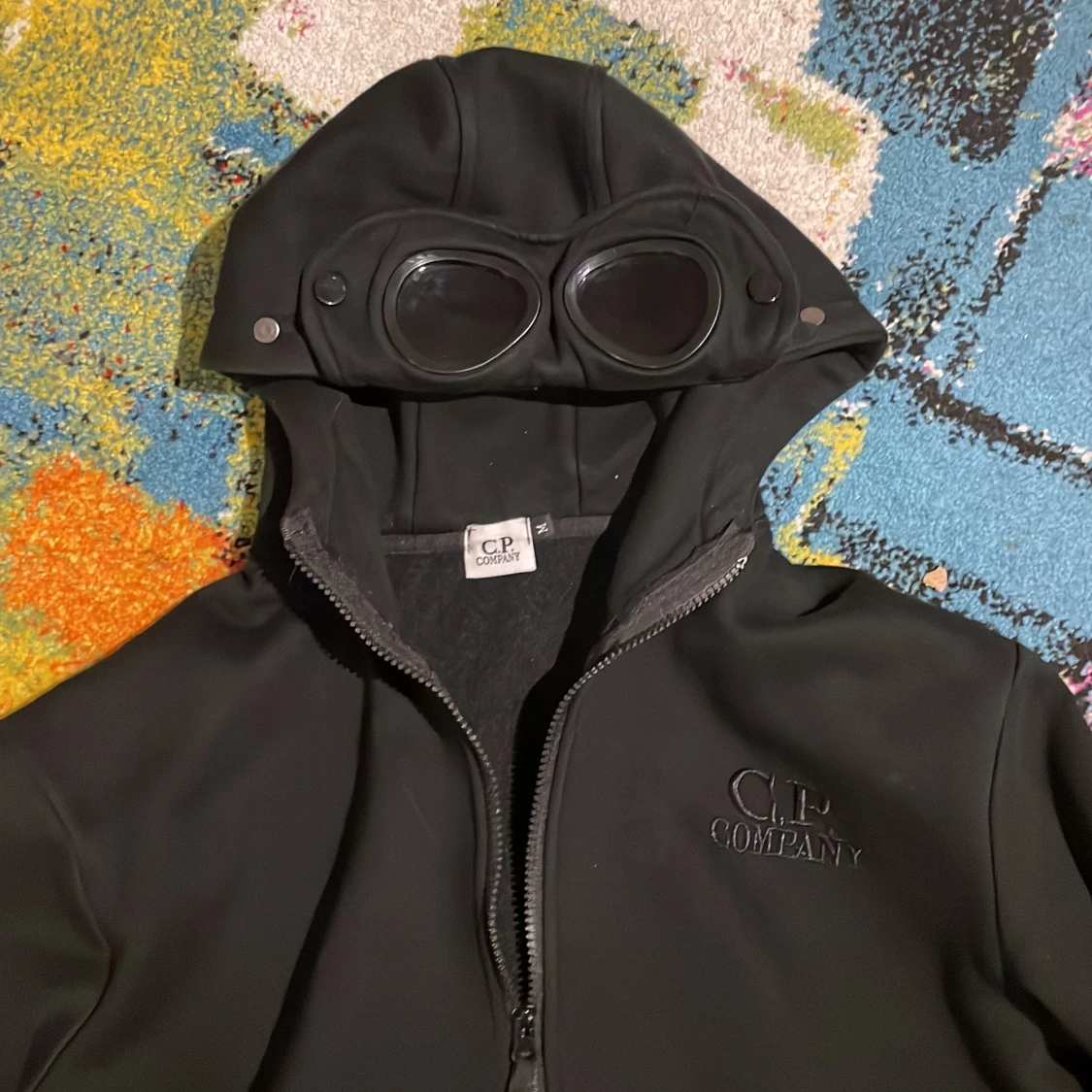Svart jacka från C.P. Company med ikonisk goggle-hood och hel dragkedja framtill. Jackan har två stora fickor, broderad logga på bröstet och är tillverkad i ett mjukt, stretchigt material. Perfekt för dig som vill sticka ut med en unik streetwear-look. Hoodien är en m men sitter som en small. Tar även byten