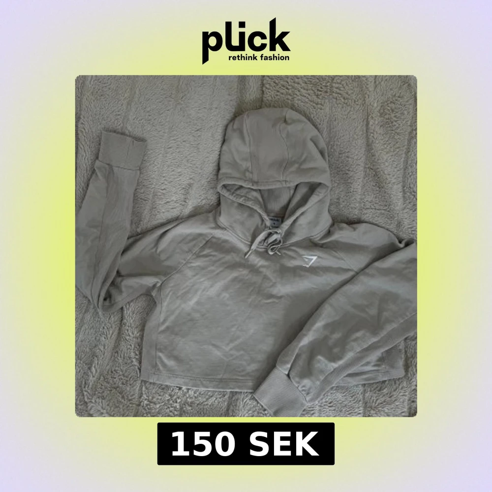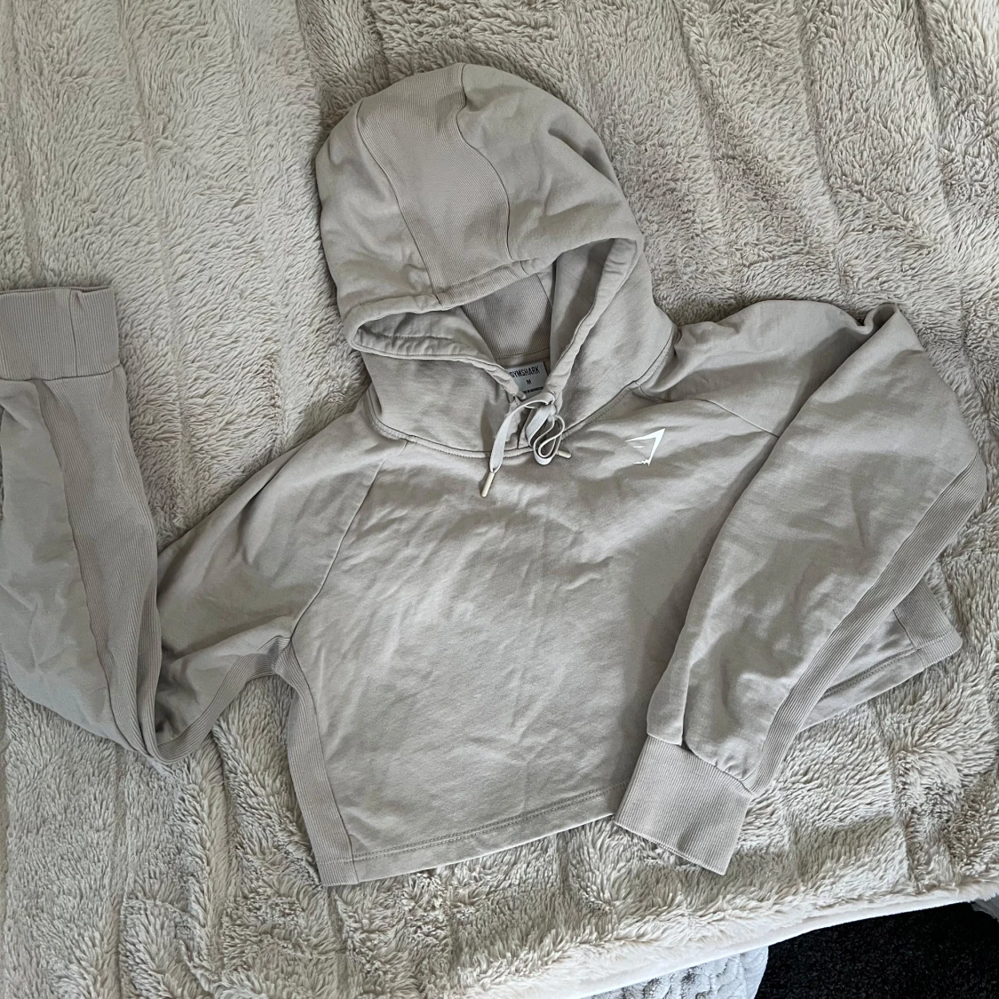 Snygg beige croppad hoodie från Gymshark med huva och snörning. Tröjan har långa ärmar med breda muddar. supersnygg men tar plats i garderoben.