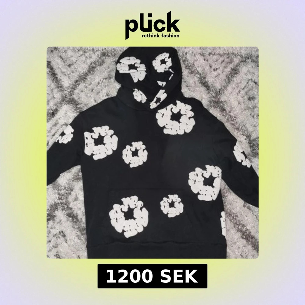 Svart hoodie från Denim Tears med stora vita blommönster över hela tröjan. Tröjan har huva och en klassisk magficka framtill. Tillverkad i USA och gjord i mjuk bomull, perfekt för dig som gillar streetwear med unik design.