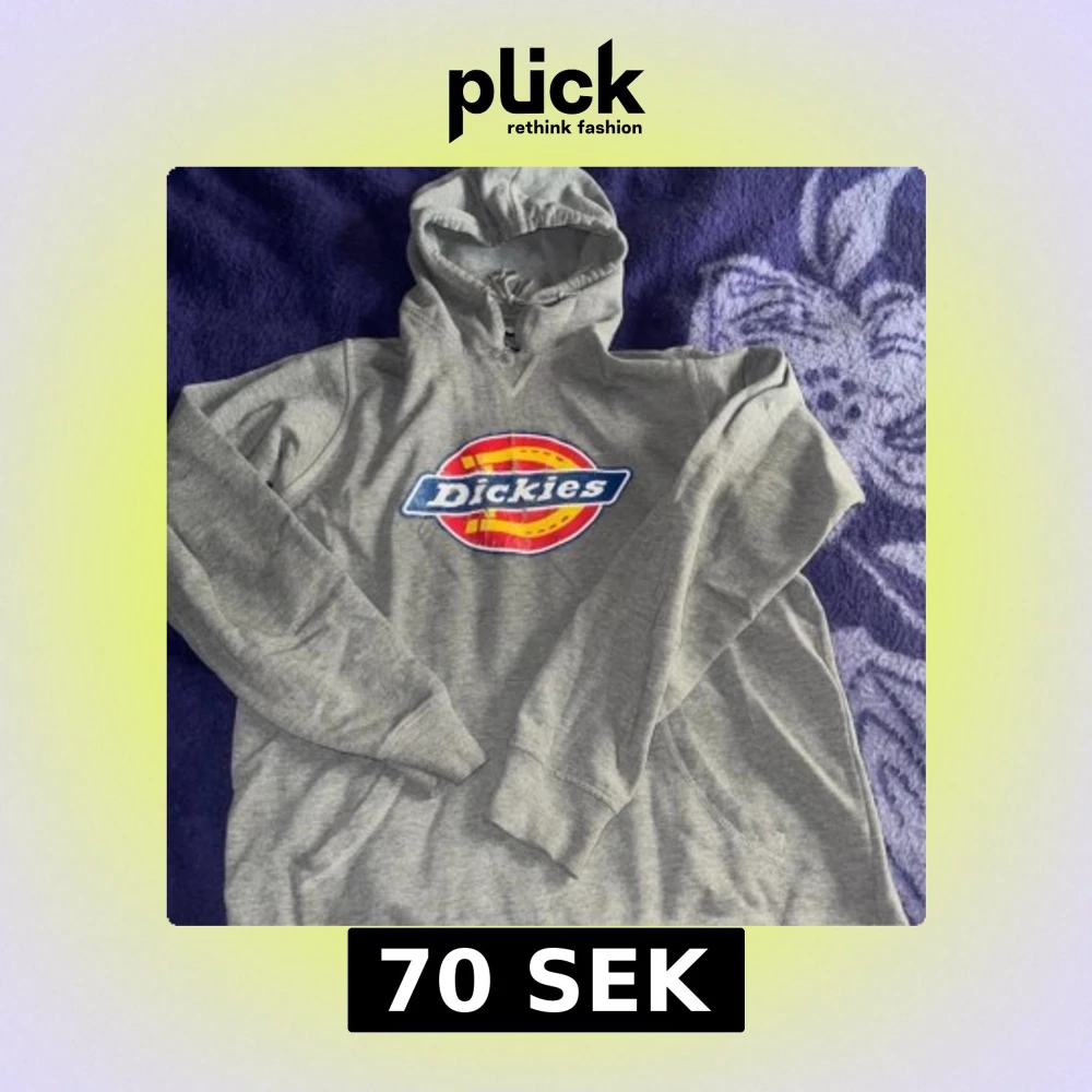 Grå hoodie från Dickies med stor färgglad logga på bröstet. Den är använd väl som syns på bilderna.