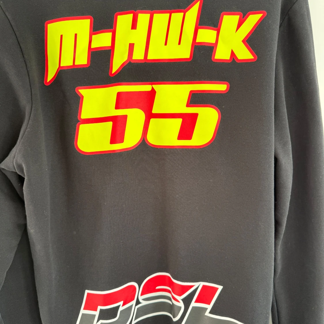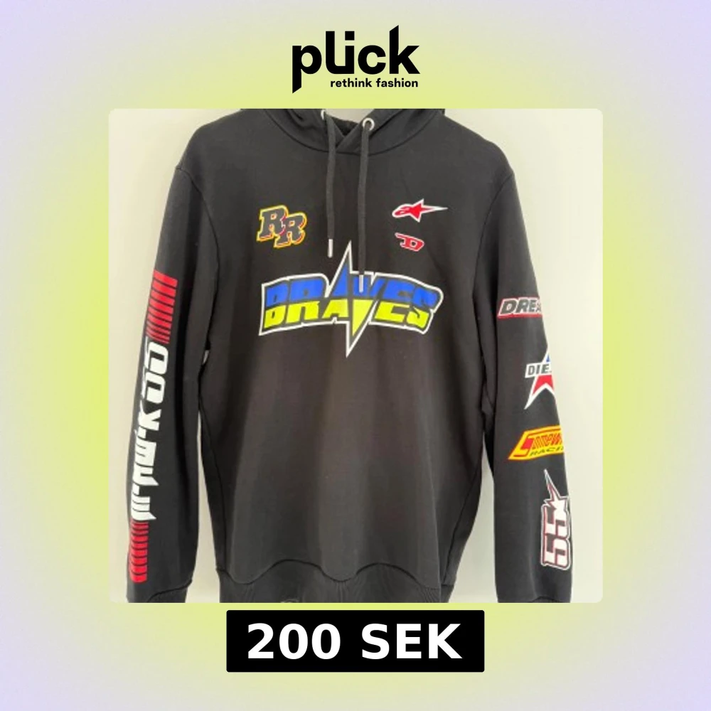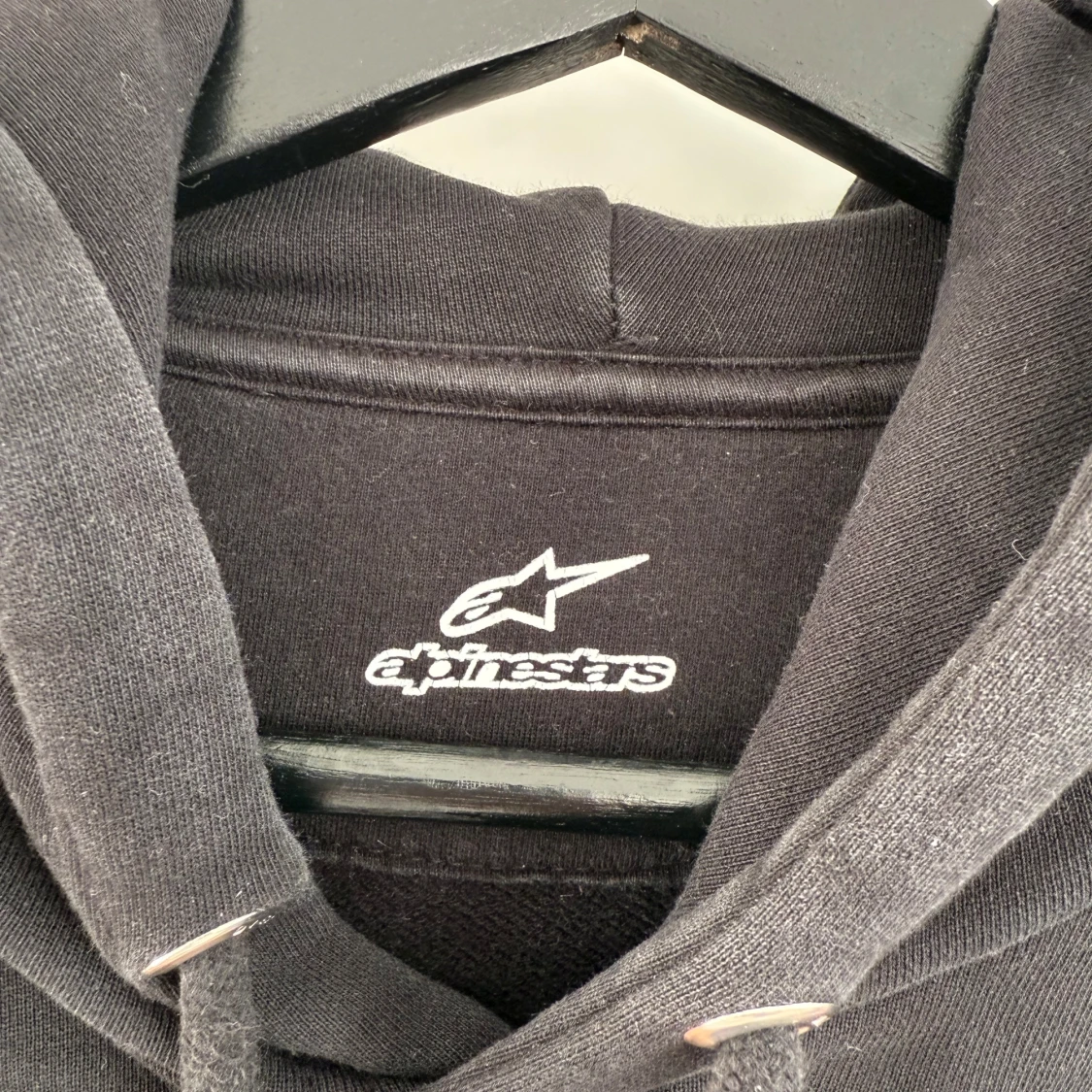 Svart hoodie från Diesel Alpinestars i storlek M med färgglada racinginspirerade tryck på bröst, rygg och ärmar. Tröjan har huva med snörning och ribbade muddar.