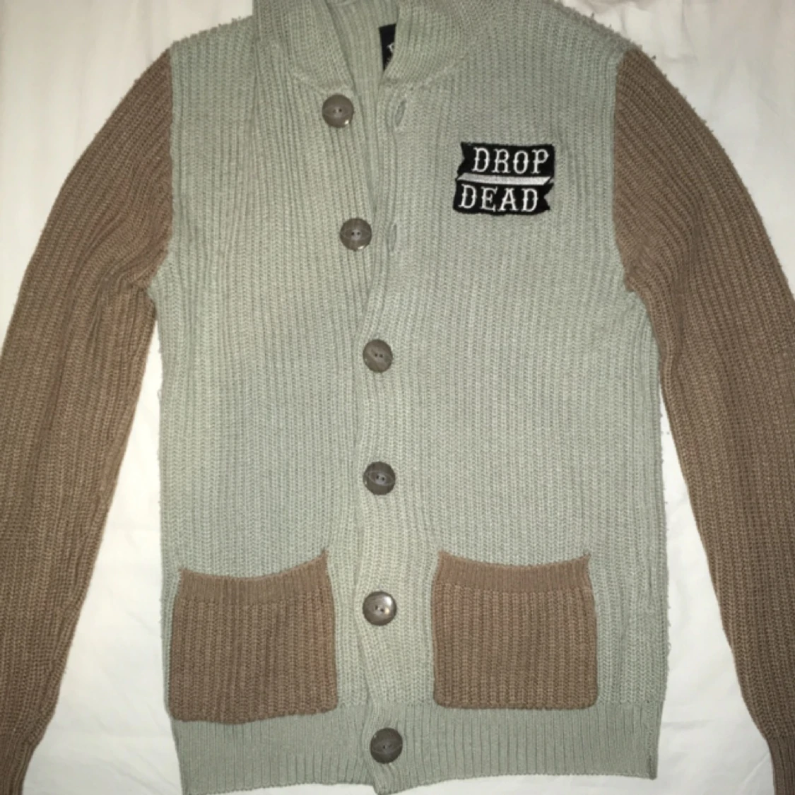 Något nopprig men riktigt bekväm stickad hoodie från Drop Dead. Sitter mer som en S