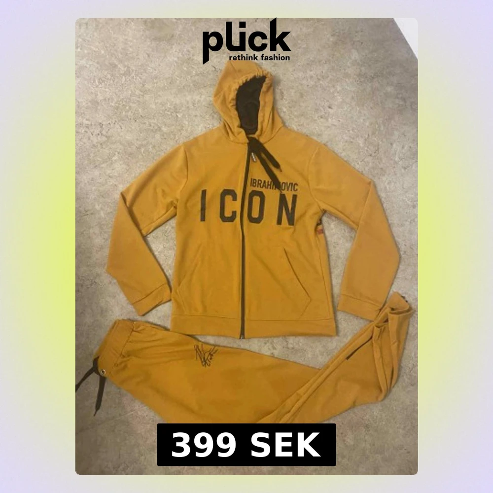 Säljer en sjukt snygg mustardgul hoodie från DSQUARED2 med svart text 'ICON' och 'IBRAHIMOVIC' på framsidan. Baksidan har en stor print med Zlatan och DSQUARED2-logga. Hoodien har dragkedja, fickor och svart snörning i huvan. Materialet är mjukt och skönt, perfekt för chill.