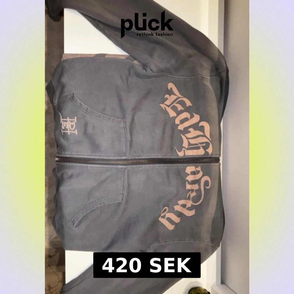 Grå hoodie från Ed Hardy med dragkedja och huva. Stor logga i beige på bröstet och unikt mönstrad rygg med asiatiskt inspirerat motiv. Mjukt bomullsmaterial och två fickor framtill. Perfekt för dig som gillar streetwear och statement-plagg.
