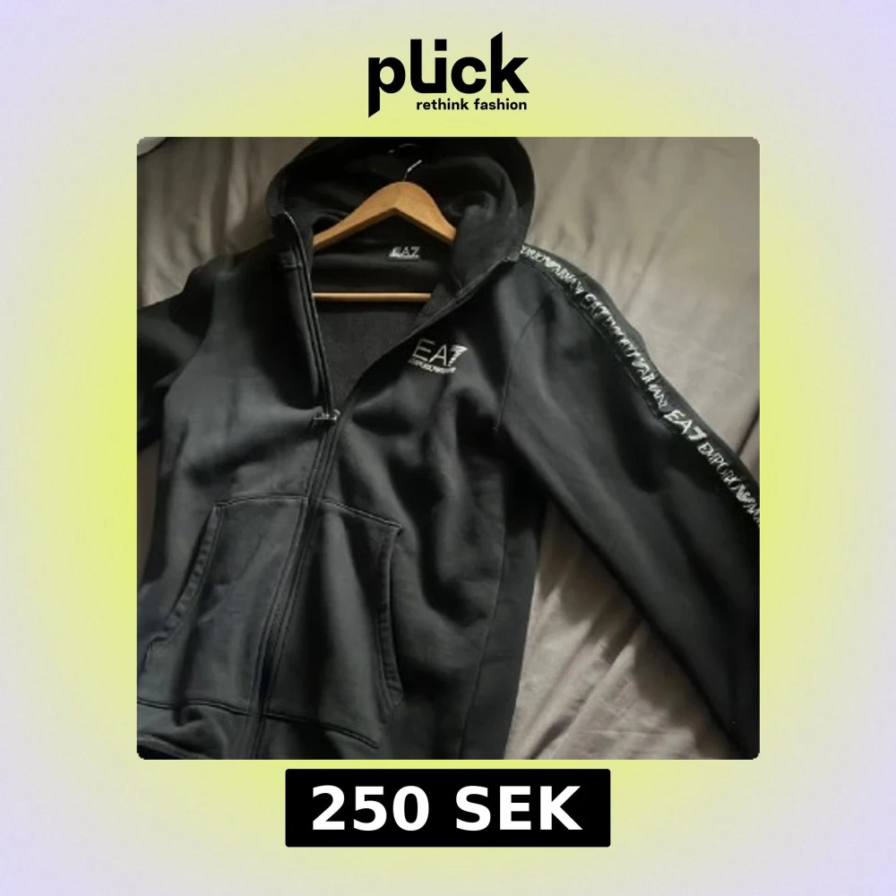 Snygg svart hoodie från Emporio Armani EA7 med dragkedja och huva. Den har märkets logga tryckt på bröstet och längs ärmen. Perfekt för en stilren och bekväm look. Fint skick!