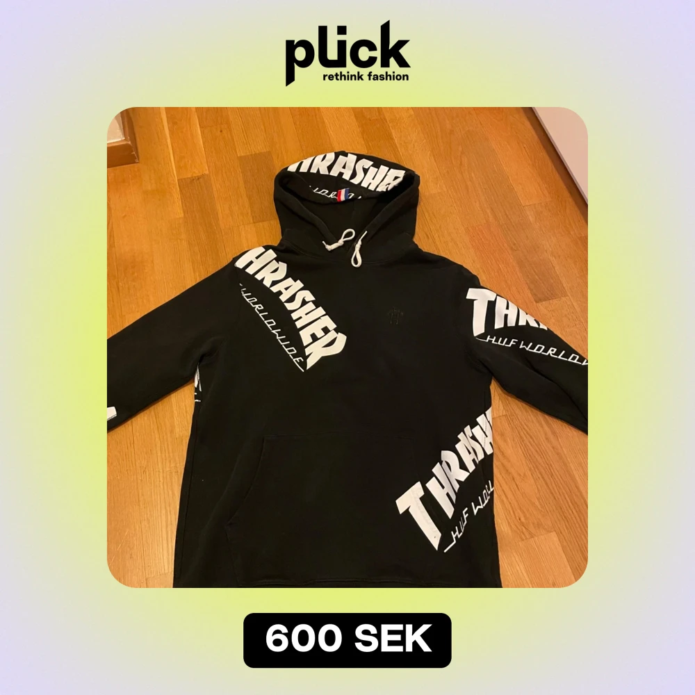 Säljer en svart hoodie från Thrasher med vit text och broderad logga. Den har en stor huva med dragsko och är perfekt för en avslappnad stil. Passar bra till både vardag och skate. Storleken är inte angiven, men den ser ut att ha en normal passform.