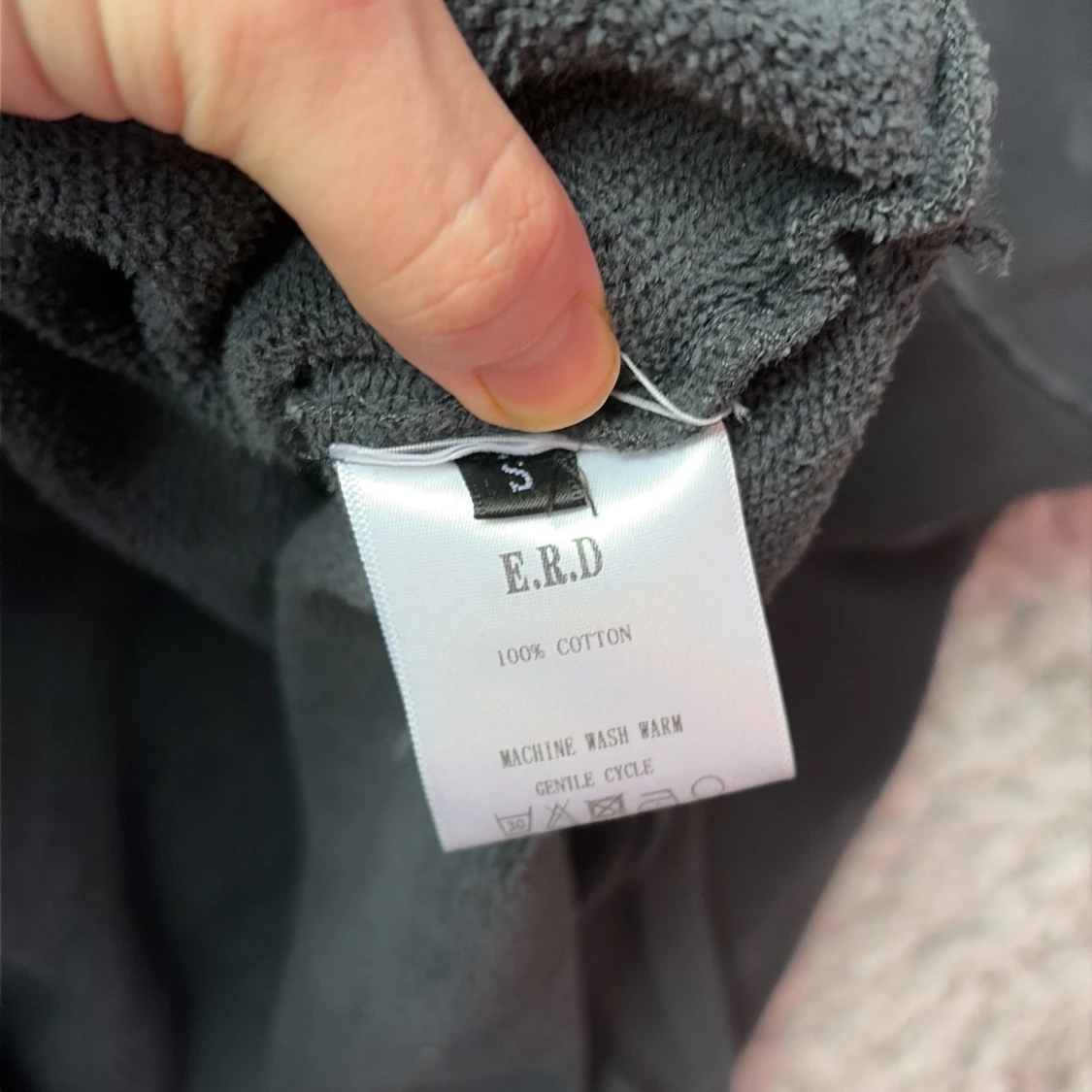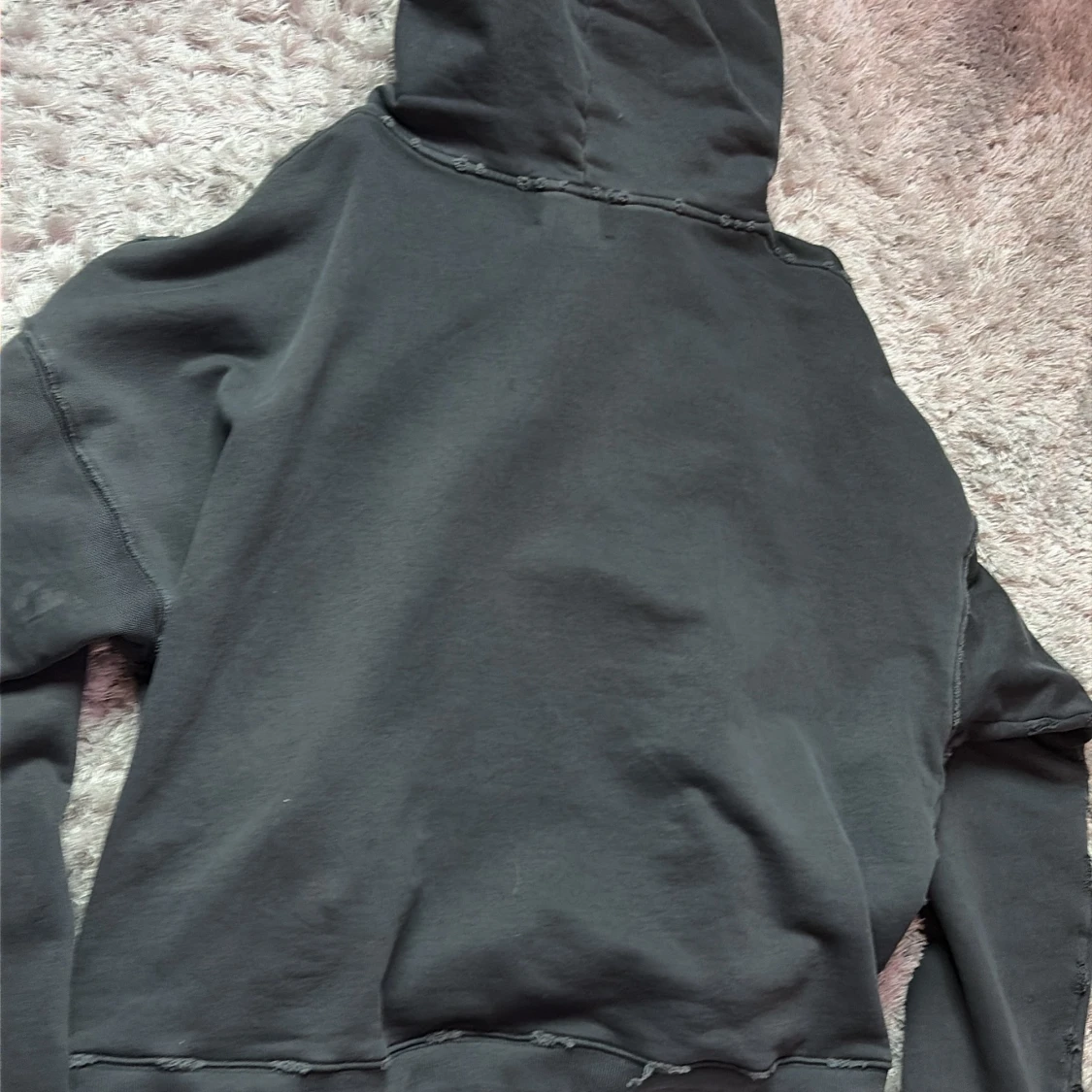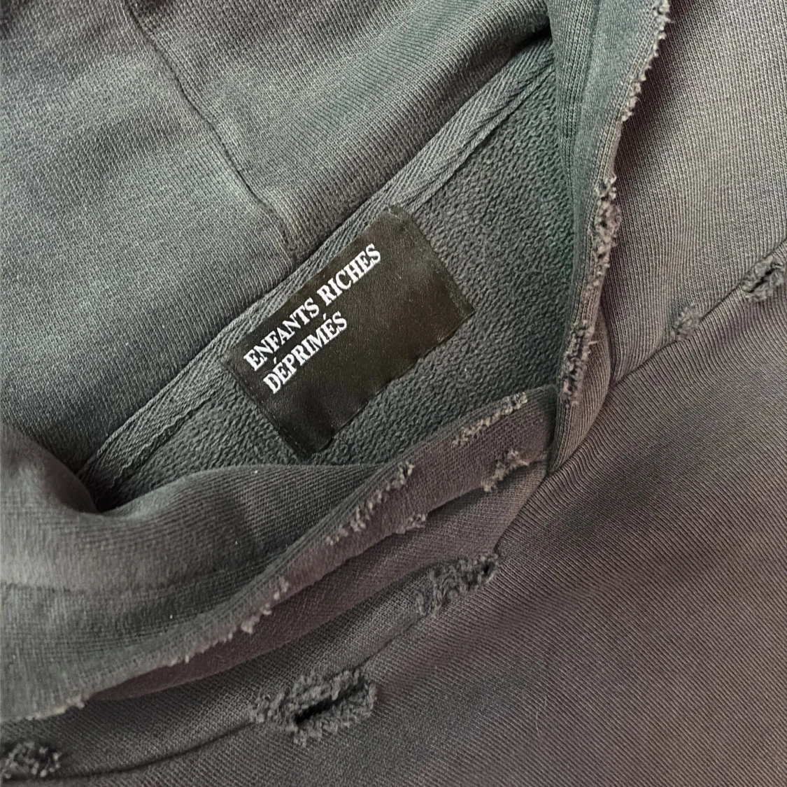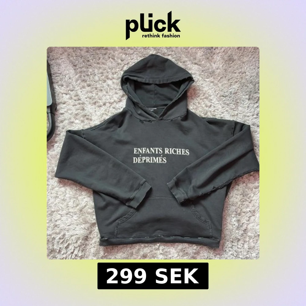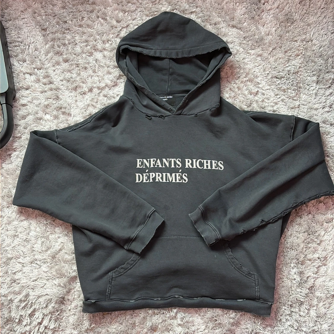 Svart hoodie från ERD / Enfants Riches Déprimés med vit text på bröstet. Tröjan har en rå och edgy look med slitna detaljer vid sömmarna, huva och känguruficka. Tillverkad i 100% bomull för skön komfort. Perfekt för dig som gillar rare streetwear med attityd. ❗️Den är storlek S, men den är såppas översized/baggy att den sitter som typ M eller L (en bra baggy look) Har några små fläckar som knappt syns