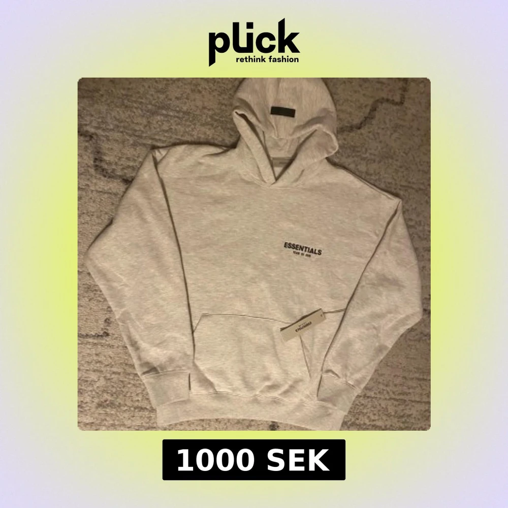 Snygg ljusgrå hoodie från Essentials Fear of God med svart logga på bröstet och stor text på ryggen. Klassisk känguruficka framtill och huva. Perfekt för en chill och stilren look. Obs den är oversize men du kan köpa den tex om du har M då kommer den passsa perfekt men om du vill ha den baggy så köp den den storleken du har .