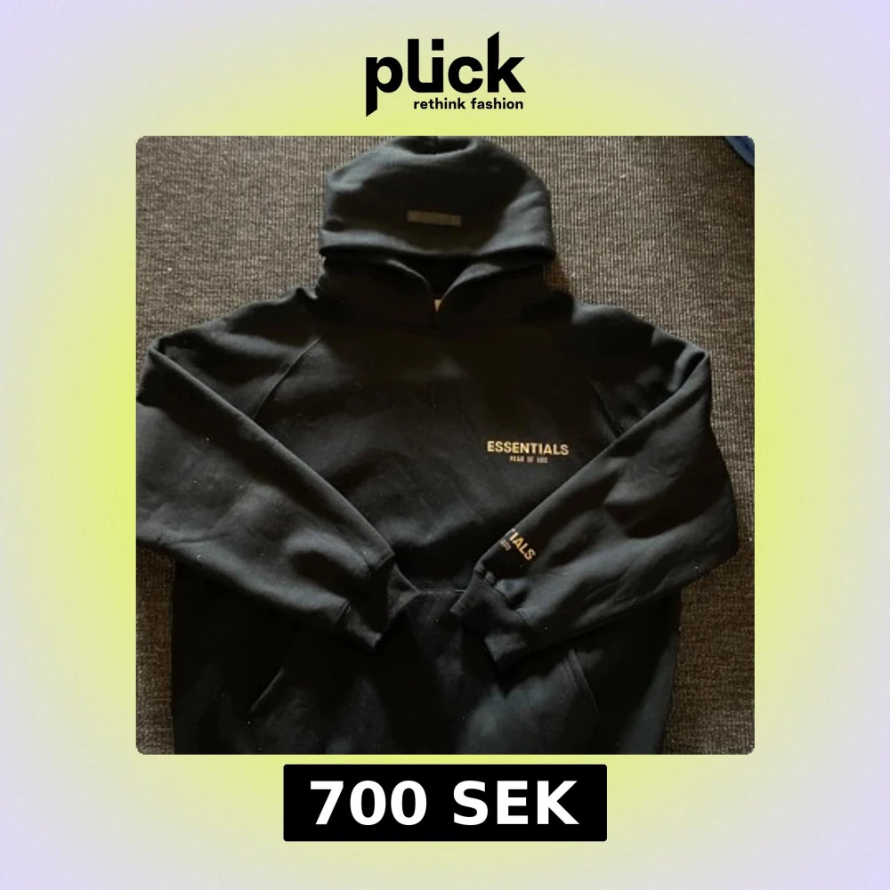 Svart essentials hoodie i storlek M aldrig använd har bara hängt i garderoben stvättas innan köp såklart och pris kan diskuteras