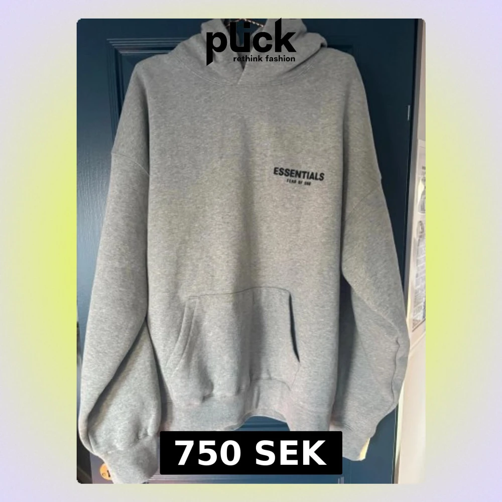 Snygg grå hoodie från Essentials Fear of God med svart logga på bröstet och stor text på ryggen. Klassisk känguruficka framtill, ribbade muddar och stor huva. Tillverkad i mjuk bomullsblandning som är perfekt för en avslappnad streetwear-look.
