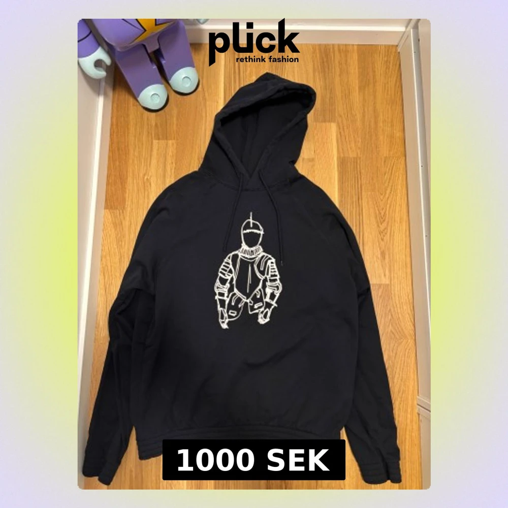 Svart hoodie från Number (N)ine med en stor vit grafisk print av en riddare på bröstet. Tröjan har huva med snörning och ribbade muddar vid ärmslut och nederkant. Perfekt för dig som gillar streetwear med unik design.