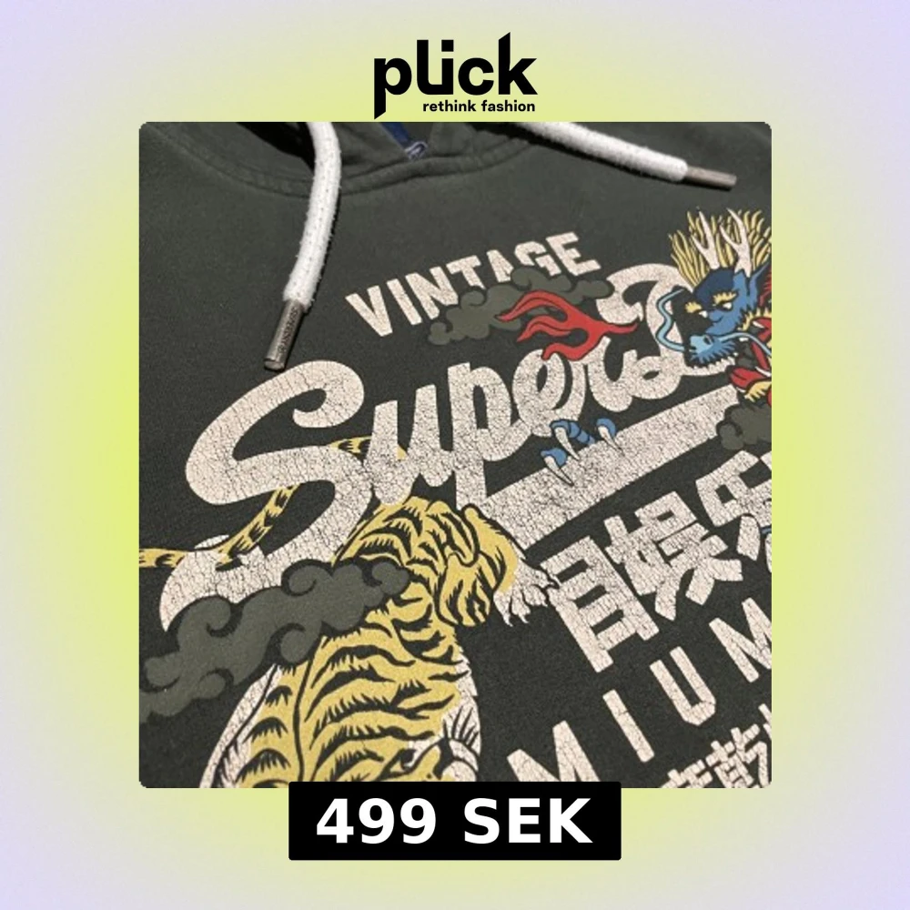 En riktigt fet Superdry hoodie med ett unikt och snyggt tryck, den är olivgrön ish med små detaljer som en liten patch på armen och liten text på snörerna. Den har inga defekter eller någon sorts skada. Kom pm för mått, inga skambud