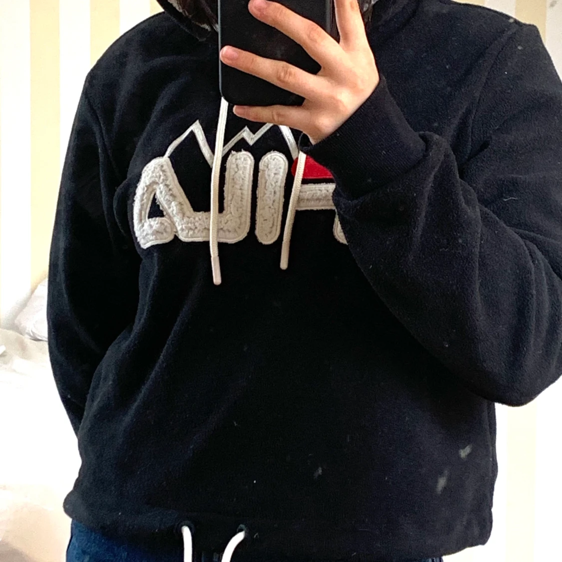 Säljer denna hoodie från FILA i jättemysigt fleecematerial. Går att knyta vid midjan så den blir cropped eller ha den som på sista bilden. Jätteskön luva också med fluffigt material innuti. Fraktar eller möts upp i Göteborg