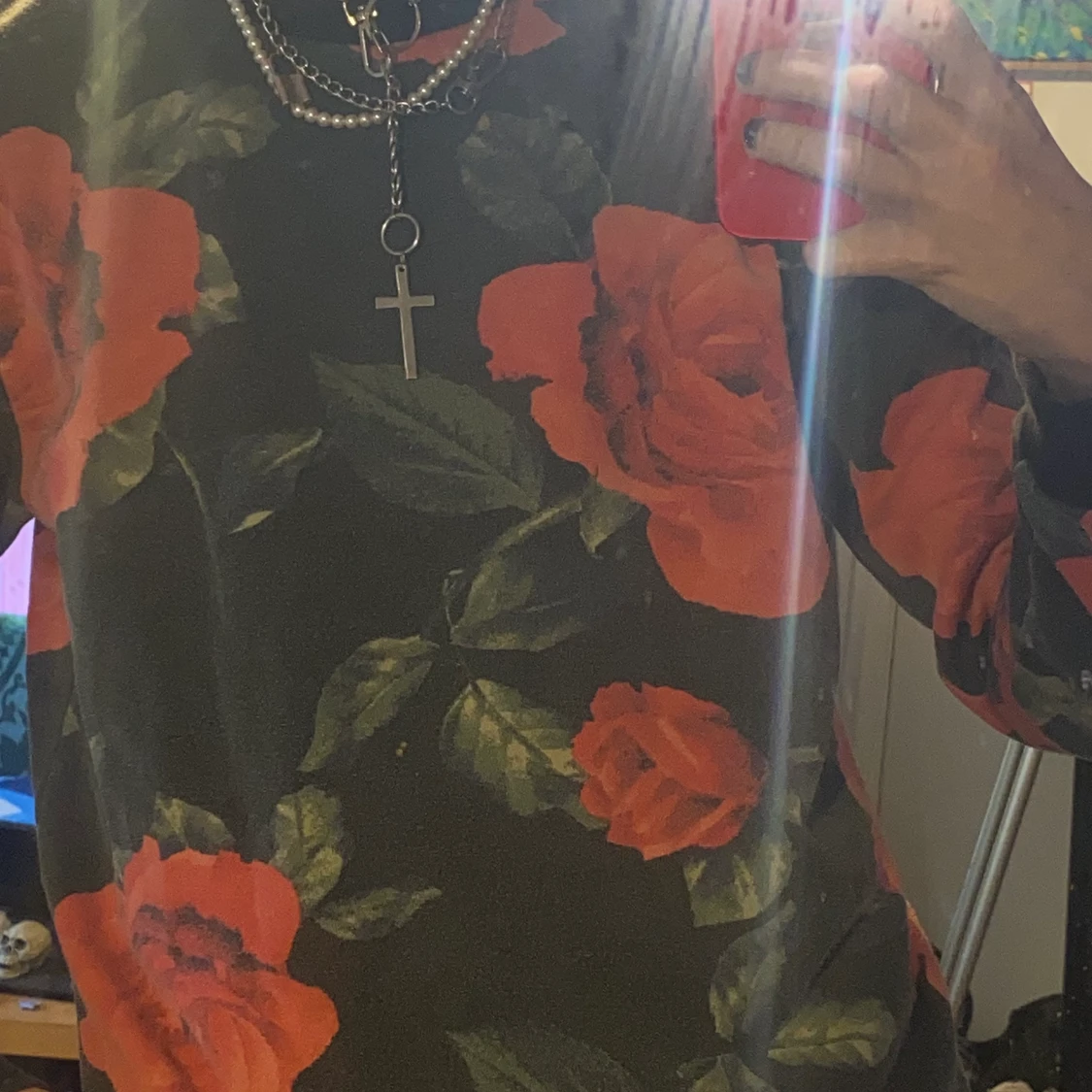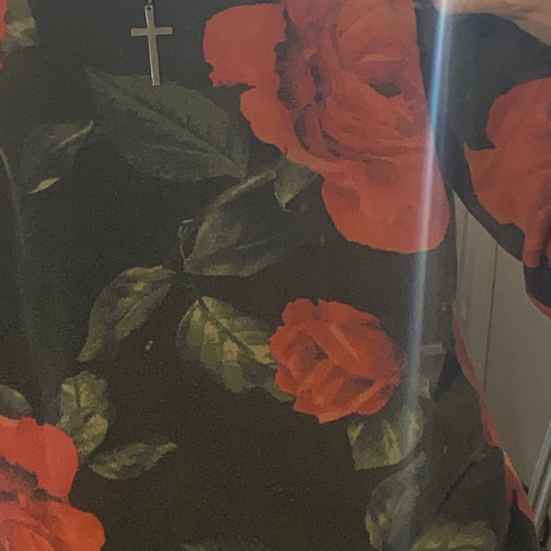 Mycket fin Sweatshirt med mönster över hela tröjan av rosor o rosbuskar i skönt material. Storlek Xs på lappen men stor i storleken, passar mig som har S elr M vanligtvis. Märke Forever 21 50%polyester 50% bomull