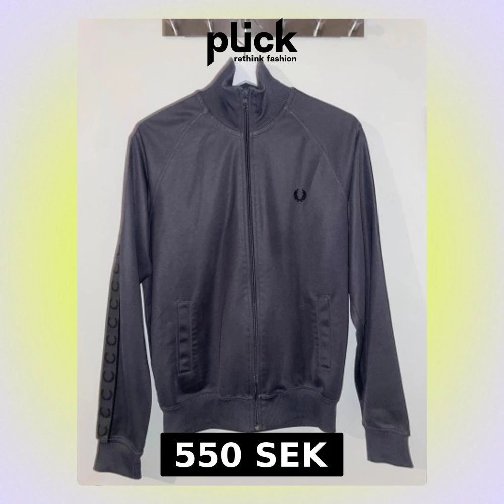 Säljer en mörkgrå track jacket från Fred Perry med svart logga på bröstet och ikoniska laurel wreath-band längs ärmarna. Jackan har hög krage, hel dragkedja och ribbade muddar. Tillverkad i mjuk polyester för en sportig och clean look.