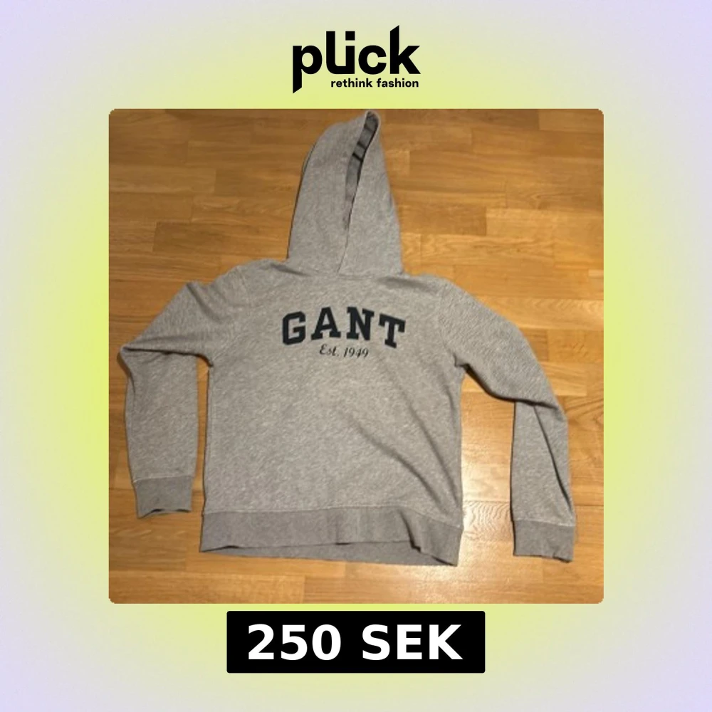 Tjena folket, nu säljer jag en snygg grå hoodie från GANT med mörkblå logga och texten 'Est. 1949' på bröstet. Klassisk modell med huva. Perfekt för skolan!