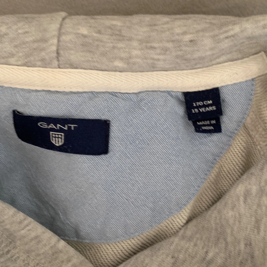 En grå Gant hoodie som passar kanske strl XS. Strl 170 i tröjan.
